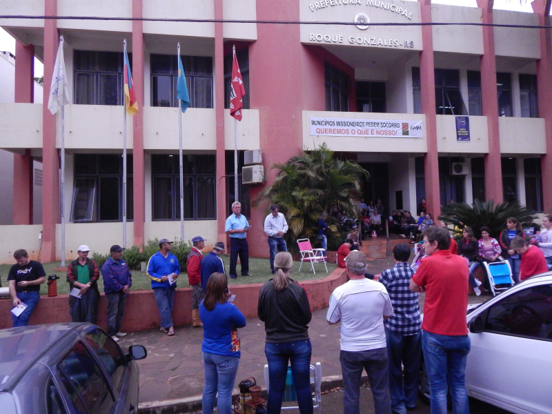 Nessa manha de sexta feira (25), como nos demais municípios missioneiros, aconteceu a paralisação dos serviços da Prefeitura municipal, onde todos os servidores públicos cruzaram os braços em uma forma de protesto e apoio aos demais municípios missioneiros contra a grave crise que estamos atravessando. Sadi Wust Ribas Prefeito Municipal, acompanhado de seu vice, Lino Berwaldt Wohlfahart, falaram aos funcionários do anseio da administração em aumentar o recebimento de parte dos tributos, pois as despesas se mantém e as receitas somente diminuem, levando assim as prefeituras a um colapso financeiro impedindo o desenvolvimento e a prestação de serviços a comunidade. Após o ato municipal, prefeito Sadi e seu secretariado se dirigiram a sede da AMM em Cerro Largo.