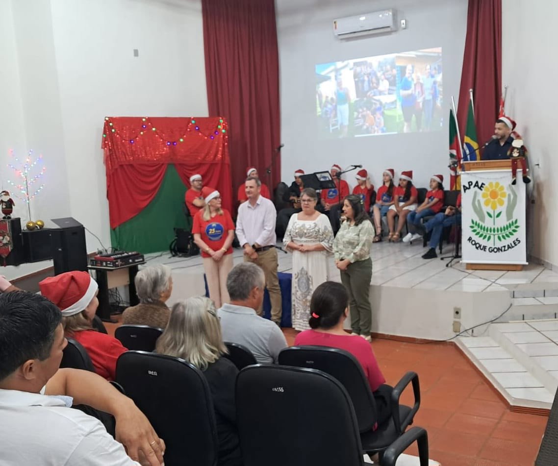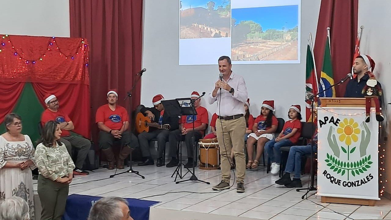 Na noite de quarta-feira, 10 de dezembro, o prefeito Fernando Mattes Machry esteve presente no show alusivo aos 25 anos da APAE de Roque Gonzales. O convite para participar da celebração foi entregue pela psicóloga Sabrina Weber, pelo diretor da instituição, Álvaro Oliveira, e pelos pequenos usuários Ravi Eliezer da Silva Dorneles e Alberto Scheeren Fernandes, durante visita realizada no dia 17 de novembro.