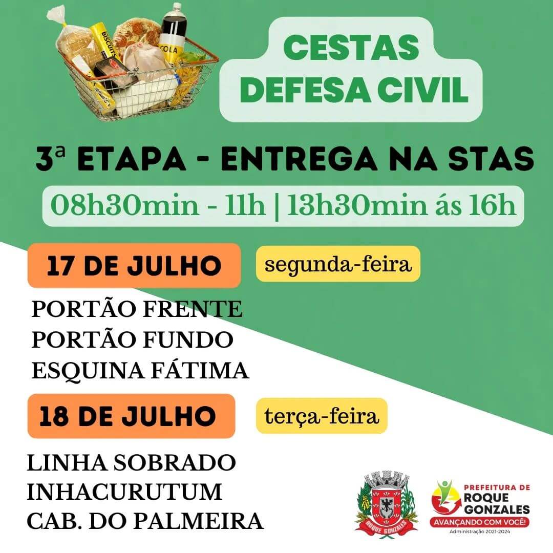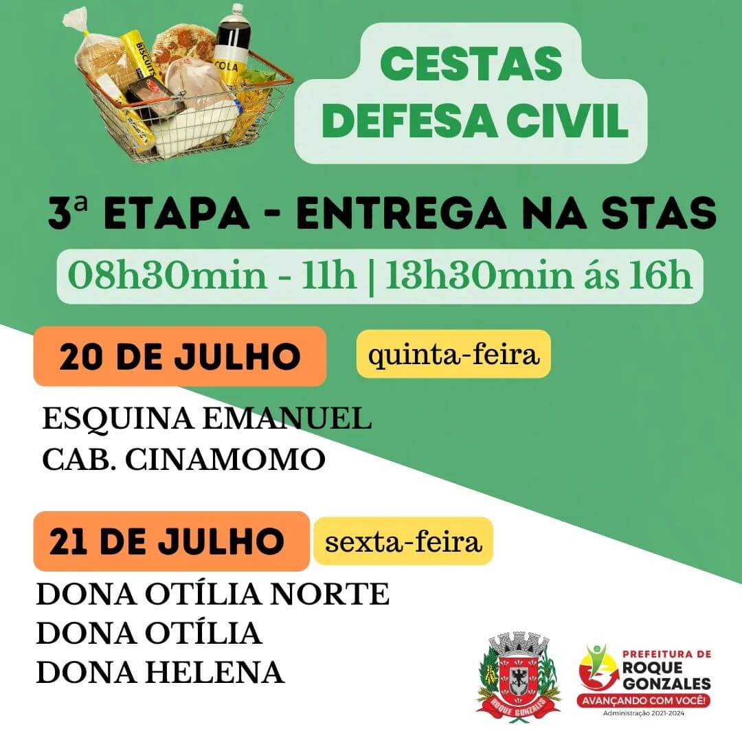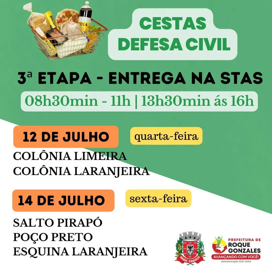 🏢 A Prefeitura Municipal por meio da Coordenadoria da Defesa Civil Municipal fará a última etapa das Cestas Básicas da Defesa Civil, recurso este designado para os agricultores afetados pela estiagem.