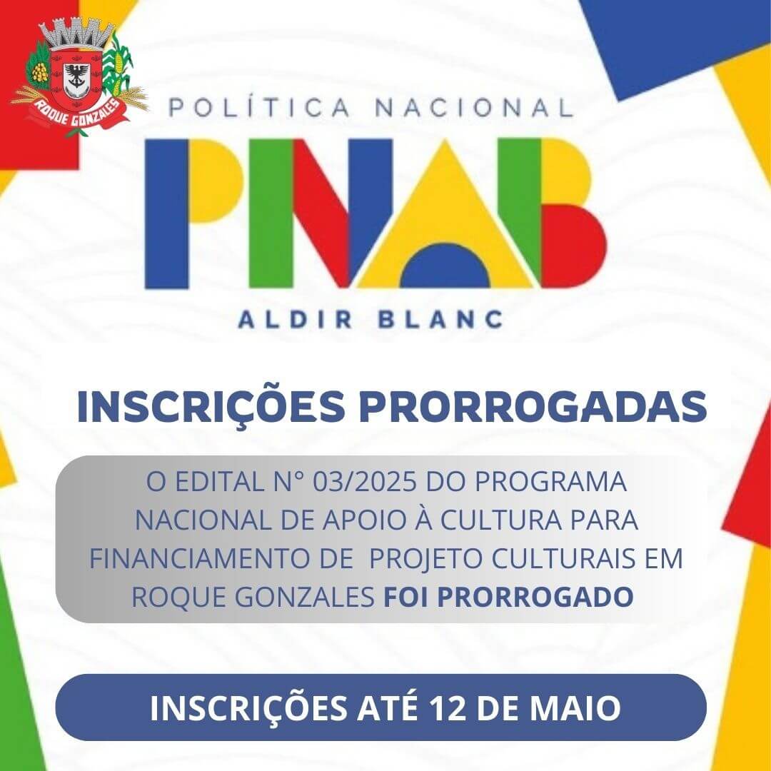 Ficam prorrogadas, até o dia 12 de maio de 2025, as inscrições referentes ao Edital nº 03/2025, que trata da Seleção de Espaços, Ambientes e Iniciativas Artístico-Culturais para recebimento de subsídio para manutenção, com recursos da Política Nacional Aldir Blanc de Fomento à Cultura (PNAB), instituída pela Lei nº 14.399/2022.