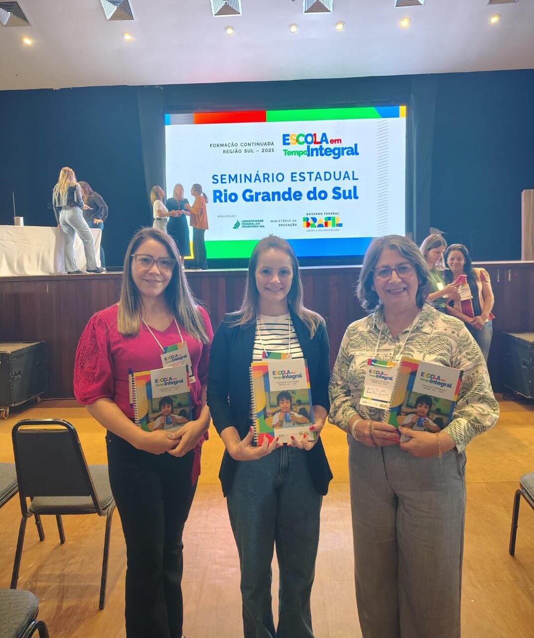 Na última terça-feira, 6 de maio, a secretária de Educação, Marilene Cruz Both, a diretora de Educação, Gicelda Ledur, e a secretária do Conselho Municipal de Educação, Izaura Silveira, participaram do Seminário Estadual de Formação Continuada “Escola em Tempo Integral”, realizado na cidade de Santa Maria.