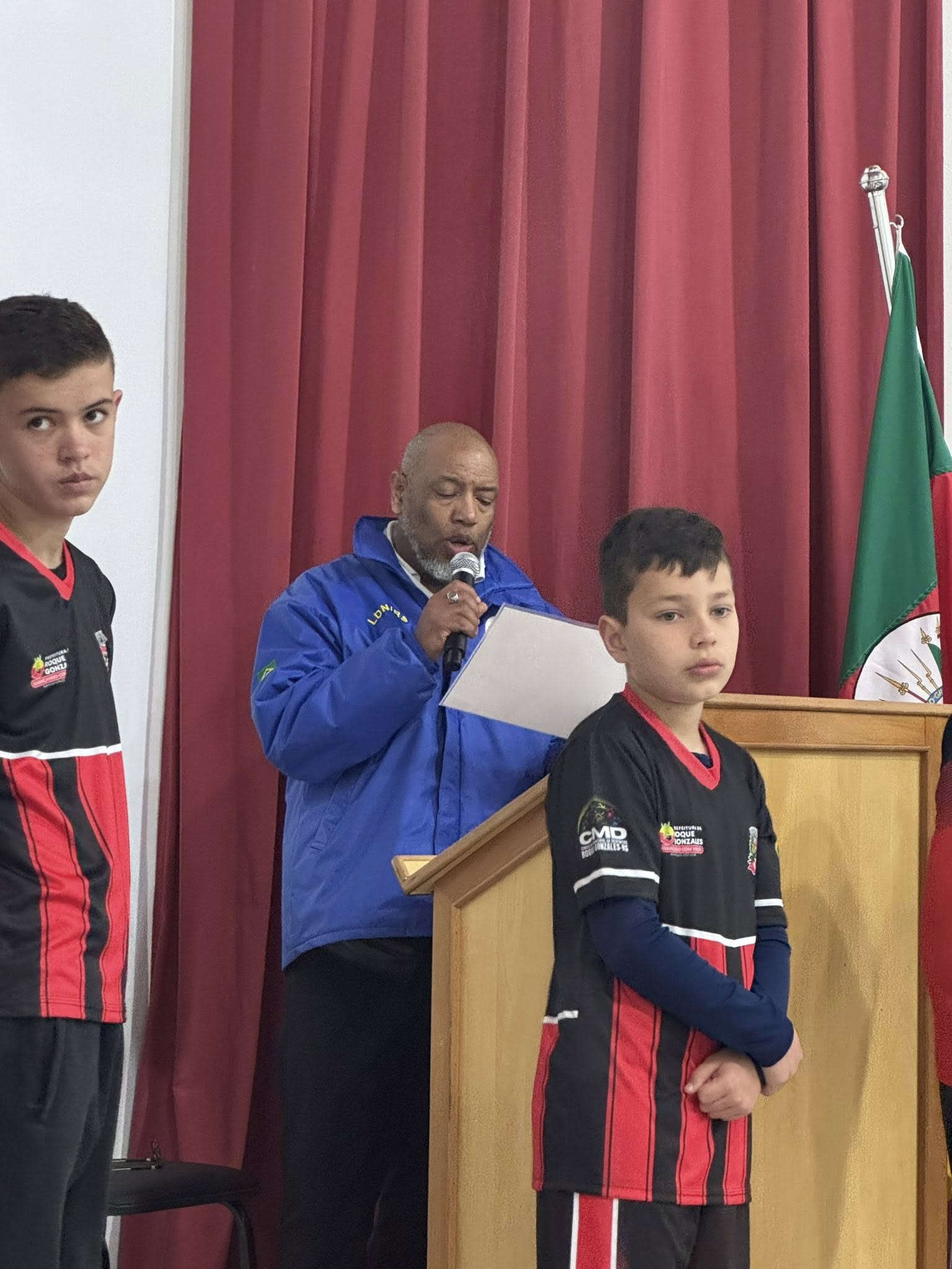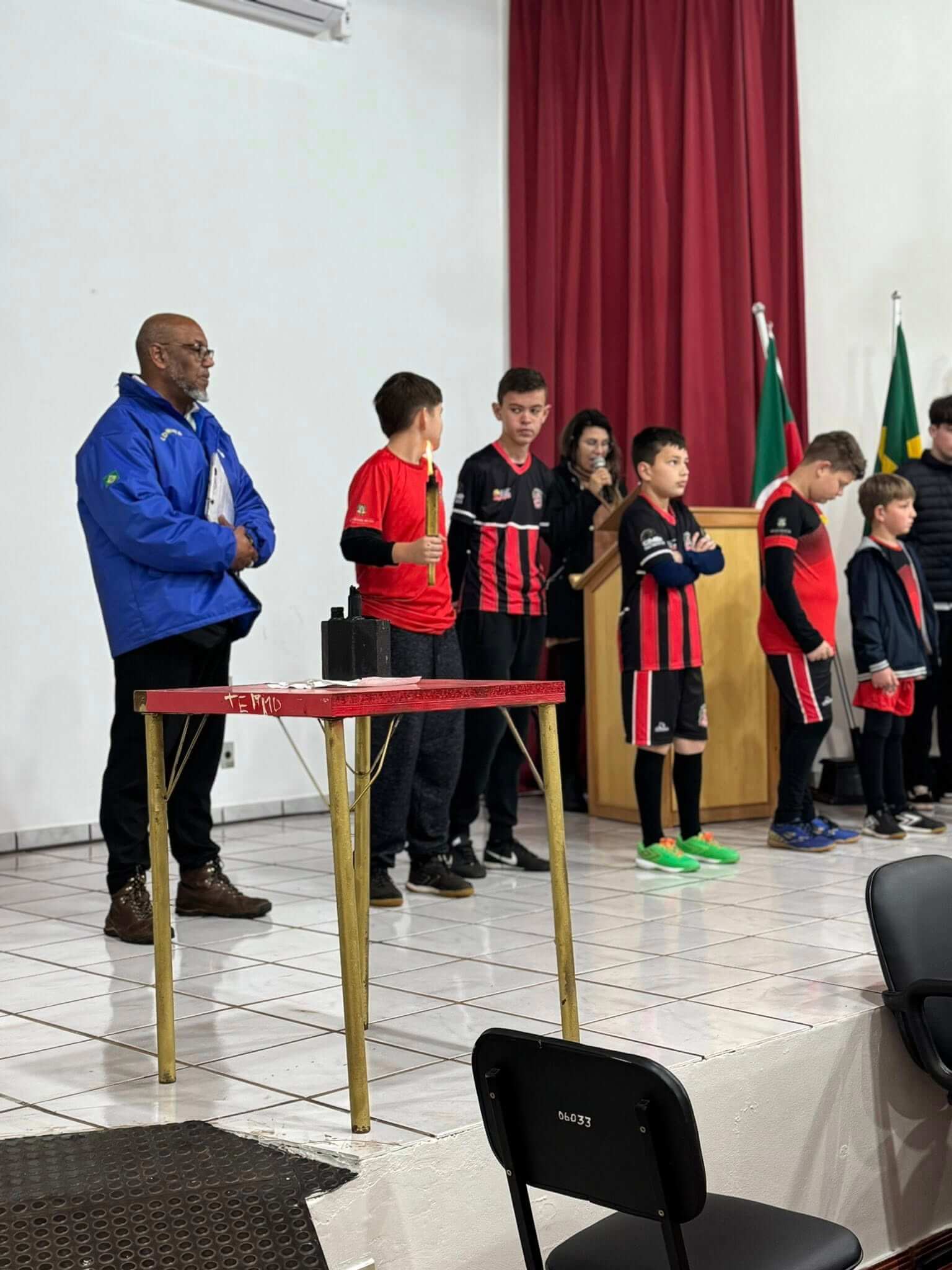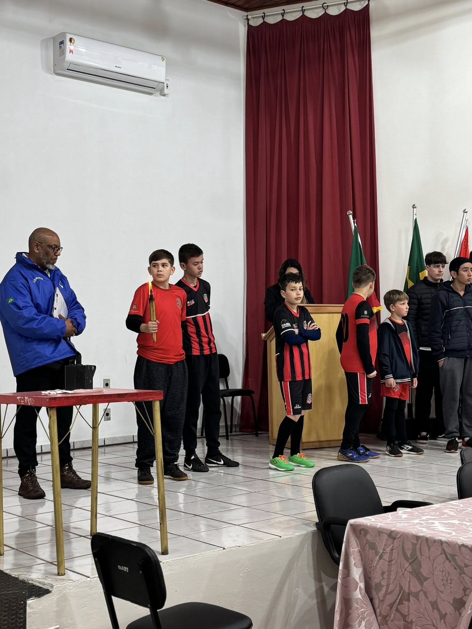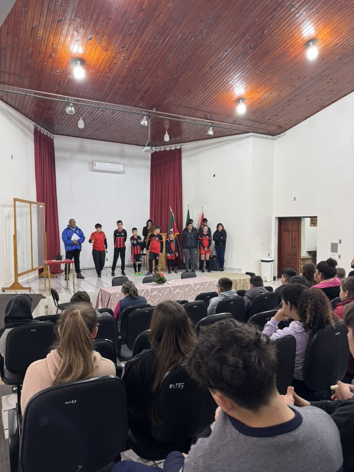 A solenidade aconteceu na Casa de Cultura Nelson Hoffmann e contou com a presença de alunos da Escolinha de Futsal e da Escola Santo Antônio, que prestigiaram o momento cívico.