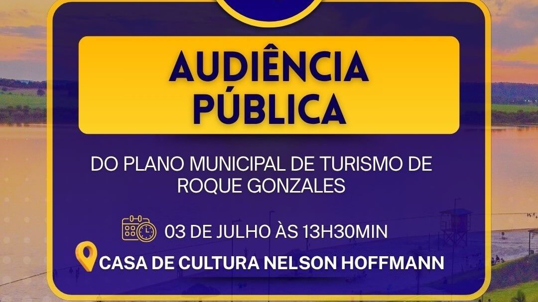 A Administração Municipal de Roque Gonzales convida toda a comunidade para participar da Audiência Pública sobre o Plano Municipal de Turismo, que será realizada na próxima quinta-feira, dia 3 de julho, às 13h30min, na Casa de Cultura Nelson Hoffmann, localizada na Rua Padre Anchieta, nº 72.