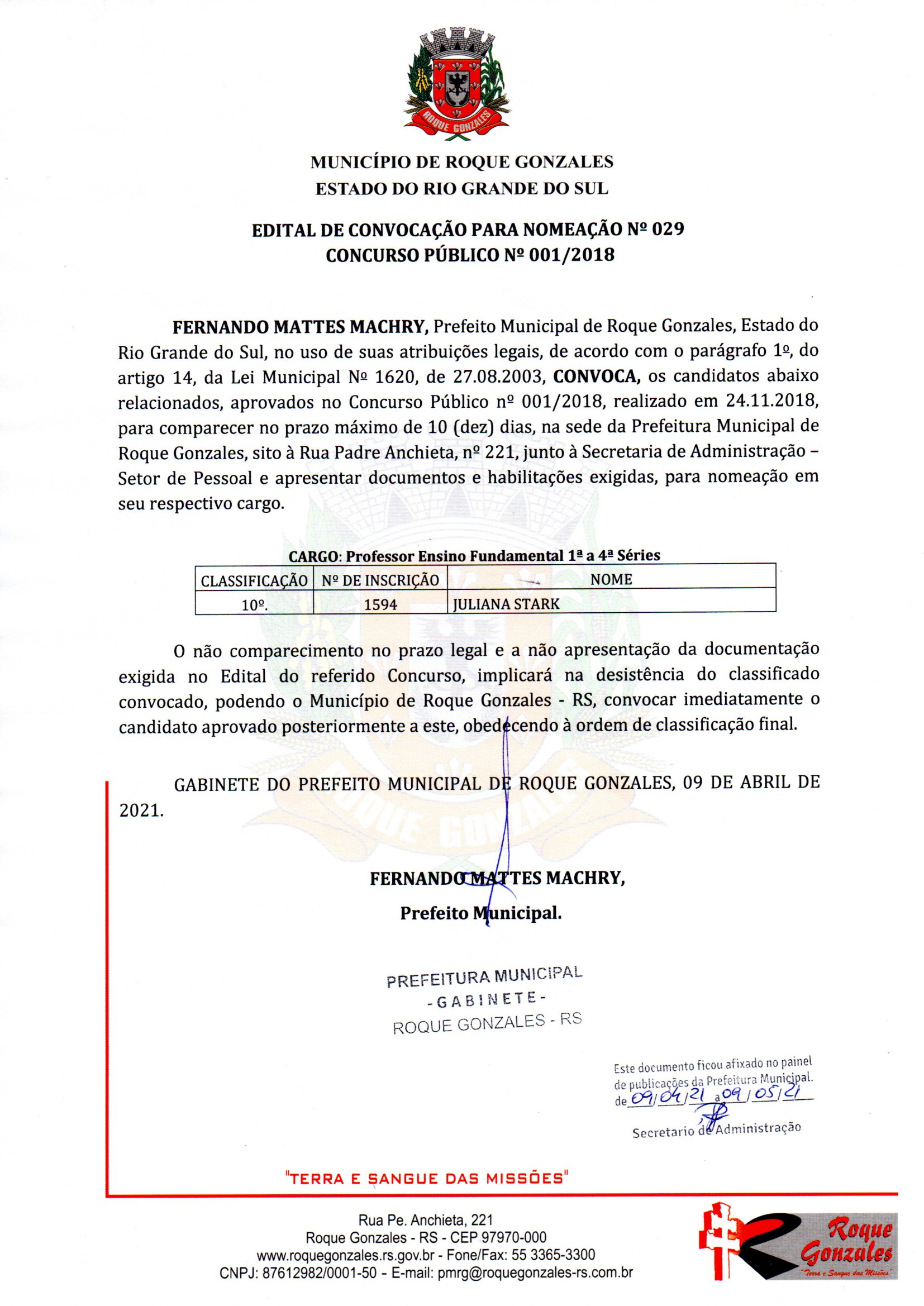EDITAL DE CONVOCAÇÃO PARA NOMEAÇÃO Nº 029 - PROFESSOR ENS. FUND. 1ª A 4ª SÉRIES