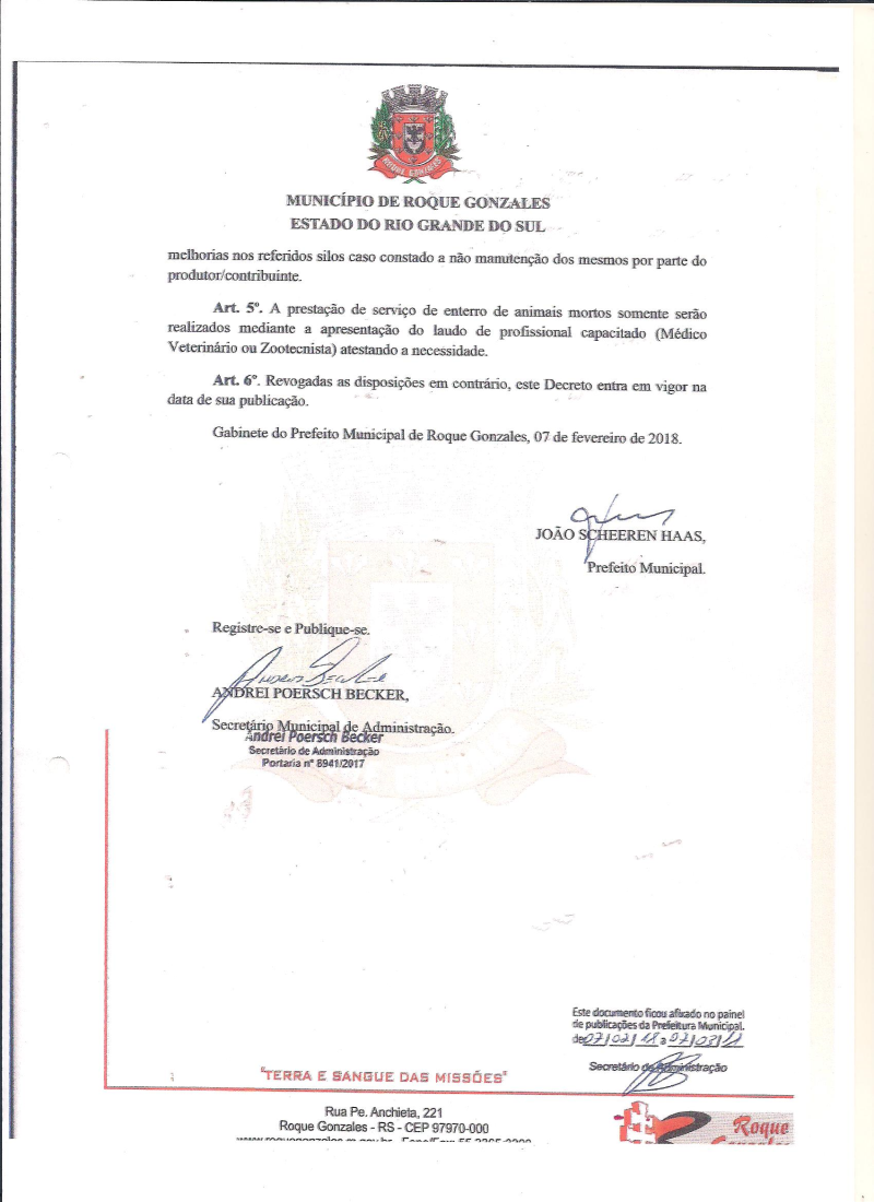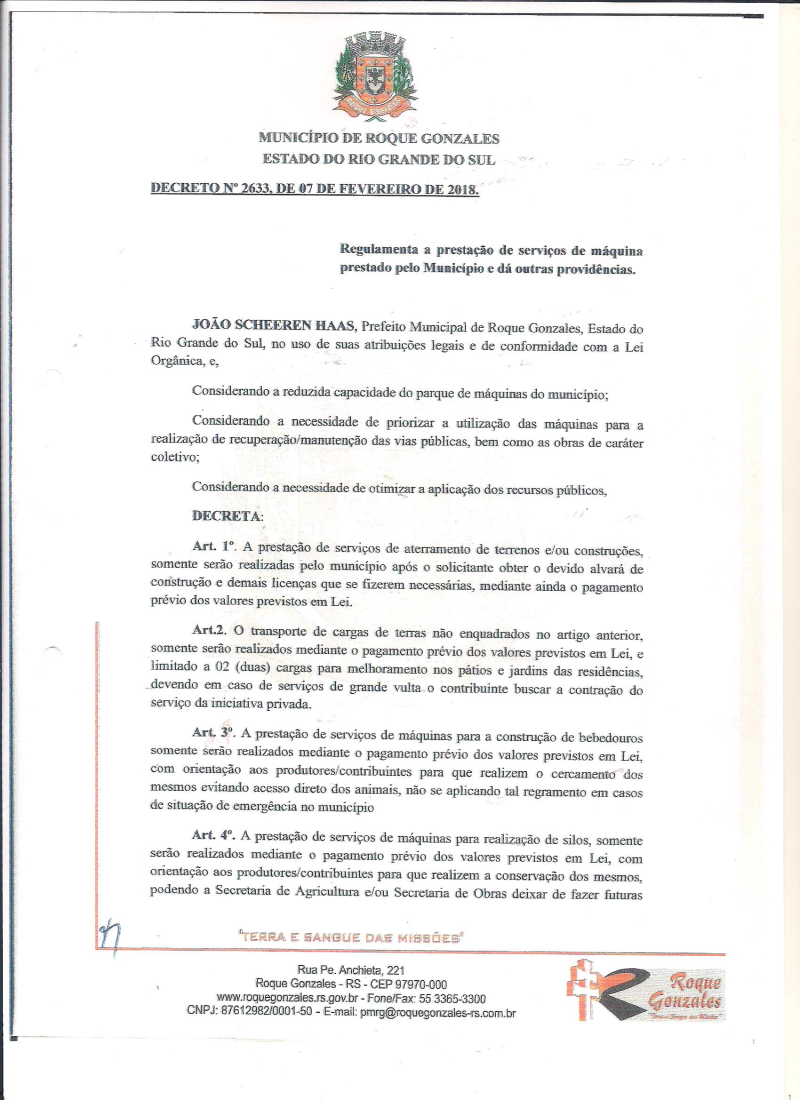 A Prefeitura de Roque Gonzales publicou um decreto que regulamenta a prestação de serviços de máquina prestado pelo Município. O Decreto N° 2633, de 07 de fevereiro de 2018, considera a necessidade de priorizar a utilização das máquinas para a realização de recuperação e manutenção das vias públicas, bem como as obras de caráter coletivo.