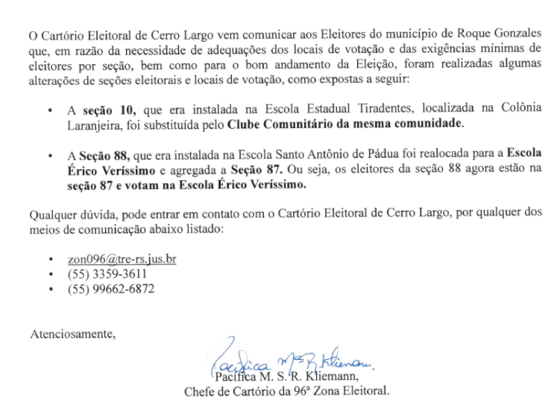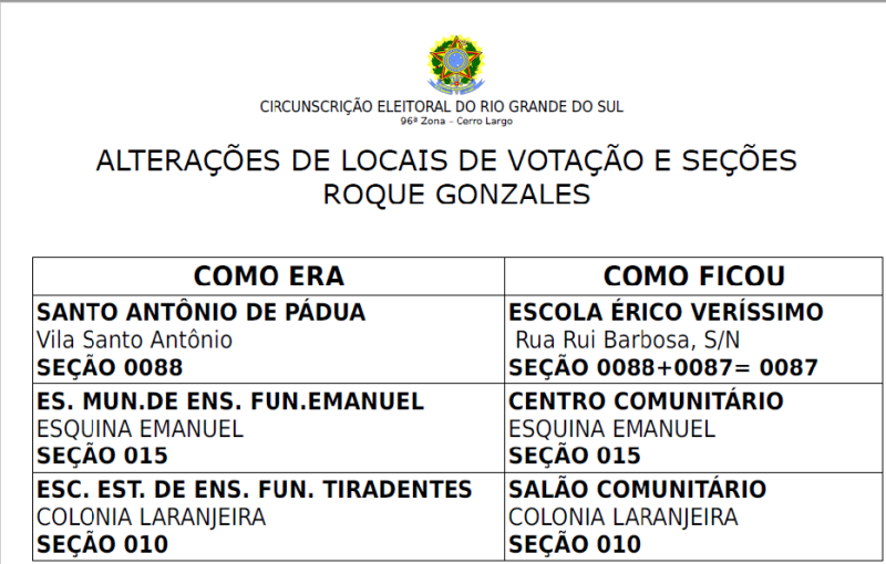 O Cartório Eleitoral de Cerro Largo vem comunicar aos Eleitores do município de Roque Gonzales que, com razão da necessidade de adequações dos locais de votação e das exigências mínimas de eleitores por seção, bem como para o bom andamento da Eleição, foram realizadas algumas alterações de seções eleitorais e locais de votação, como expostas a seguir: