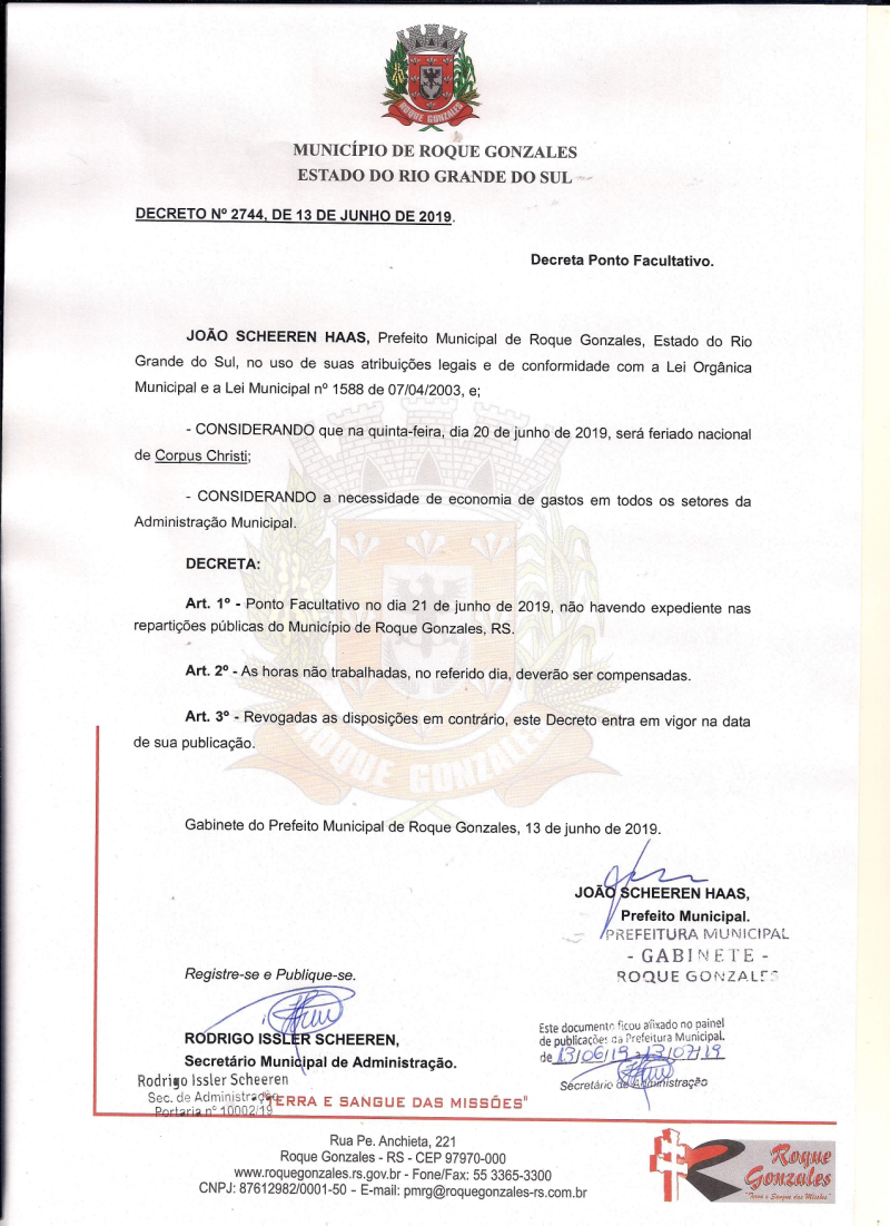 A Prefeitura Municipal de Roque Gonzales, por meio do decreto N° 2744, de 13 de junho de 2019, oficializa ponto facultativo nas repartições públicas municipais, para a próxima sexta-feira, dia 21 de junho, pois quinta-feira 20 de junho, será feriado nacional de Corpus Christi. O decreto atinge todos os órgãos da administração.