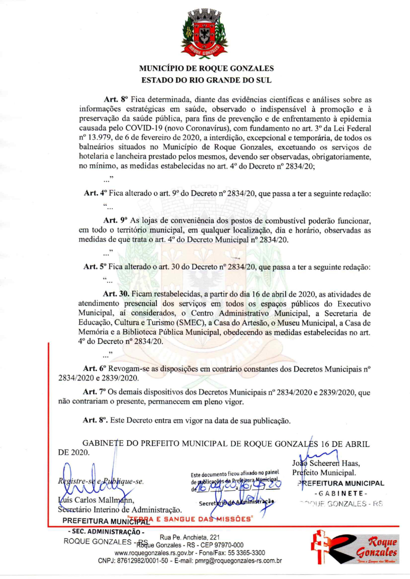 Na tarde desta quinta-feira, 16 de abril, o prefeito João Scheeren Haas assinou o Decreto n° 2.841, de 16 de abril de 2020, que altera o Decreto n° 2.834 e reitera e confirma a declaração do estado de calamidade pública e dispõe medidas para o enfrentamento da emergência de saúde pública de importância internacional decorrente do surto epidêmico de coronavírus (covid-19), no município de Roque Gonzales.