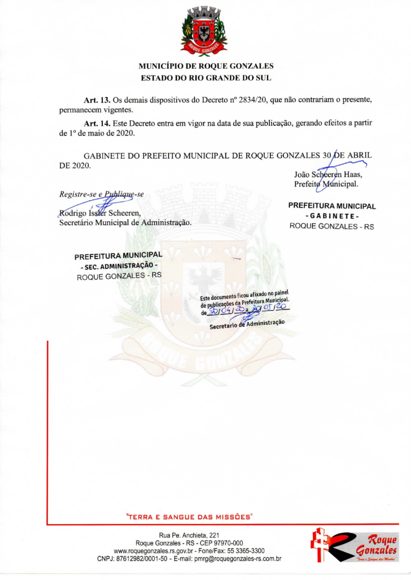 Na tarde desta quinta-feira, 30 de abril, o prefeito João Scheeren Haas assinou o Decreto n° 2.848, de 30 de abril de 2020, que altera, complementa, reitera e confirma a declaração do estado de calamidade pública e dispõe medidas para o enfrentamento da emergência de saúde pública de importância internacional decorrente do surto epidêmico de coronavírus (covid-19), no município de Roque Gonzales.