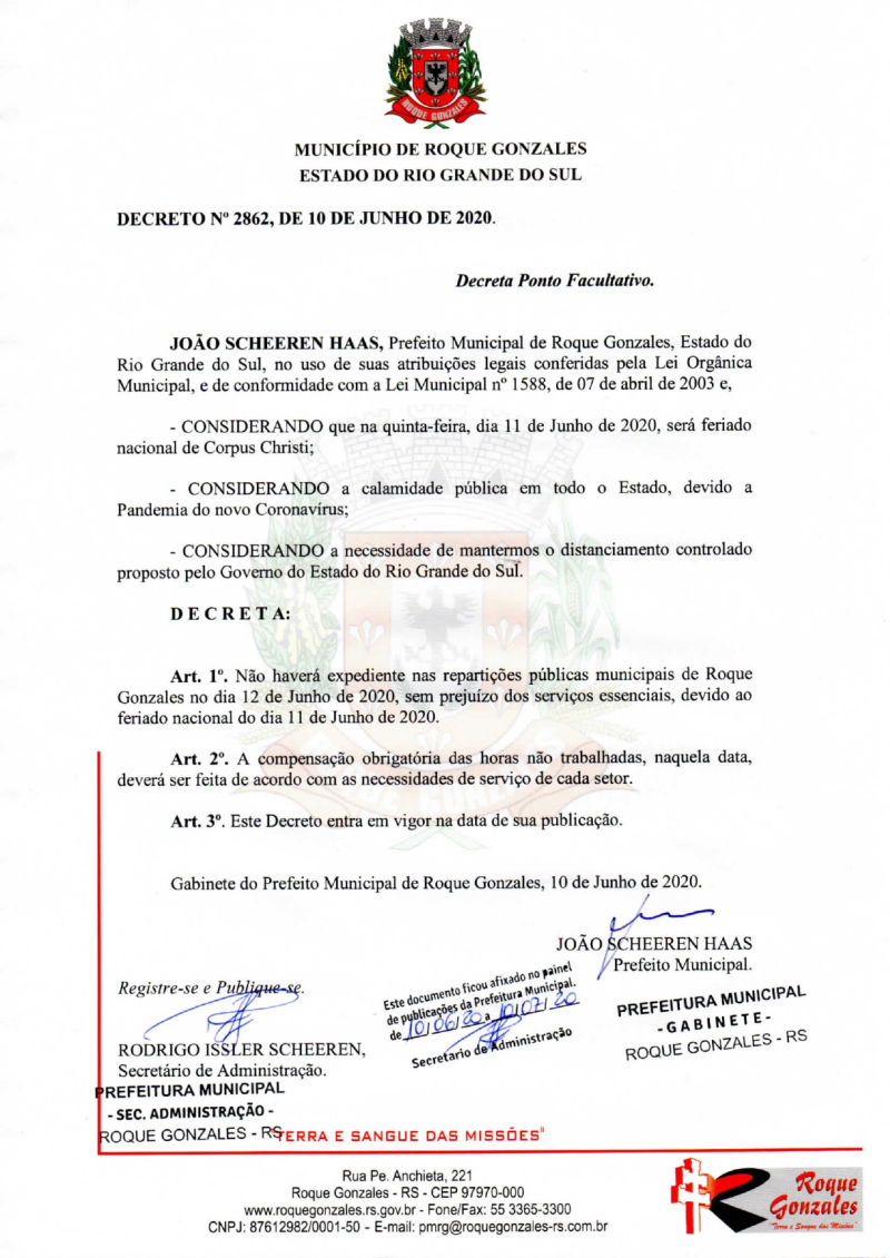 A Prefeitura Municipal de Roque Gonzales, por meio do decreto N° 2.862, de 10 de junho de 2020, oficializa ponto facultativo nas repartições públicas municipais, para a 11 de junho, será feriado nacional de Corpus Christi. O decreto atinge todos os órgãos da administração.