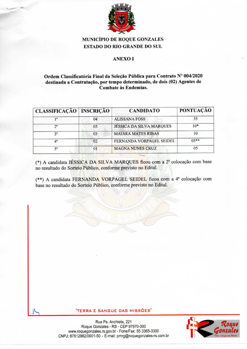 A classificação final e a homologação estão disponíveis no edital n°005, que se encontra disponível no link https://www.roquegonzales.rs.gov.br/site/editais/4751-edital-n%C2%B005-selecao-publica-para-contrato-n%C2%B00042020-agente-de-combate-a-endemias