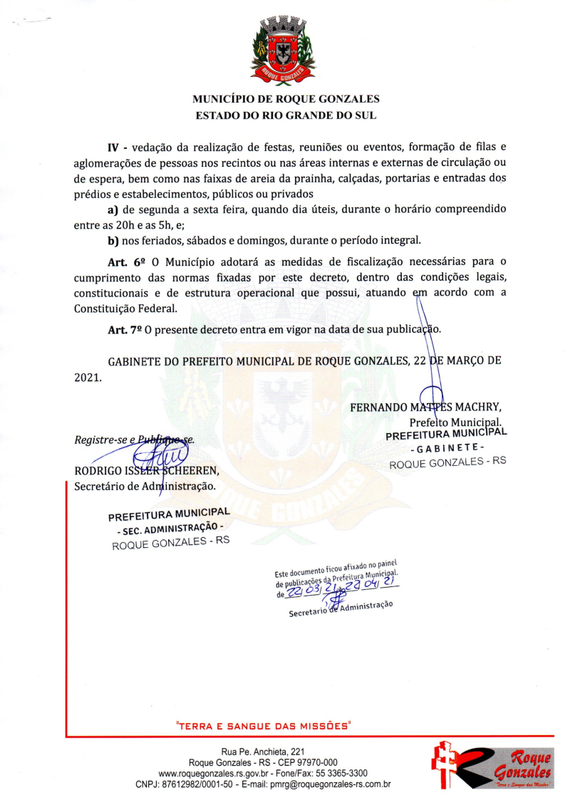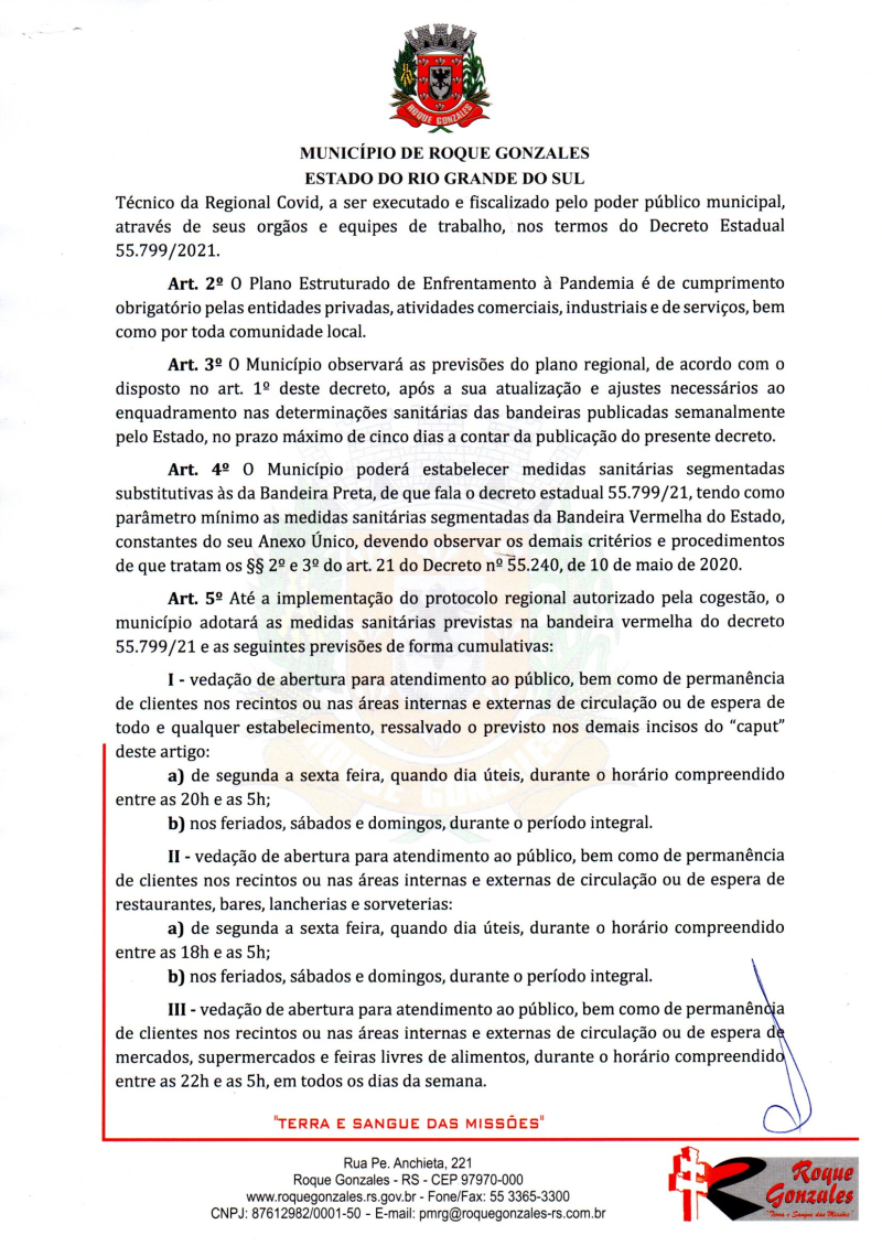 A Prefeitura de Roque Gonzales publica na manhã desta segunda (22), o decreto municipal nº 2985, o qual recepciona os protocolos definidos pelo decreto estadual nº 55.799/21, que institui medidas sanitárias segmentadas substitutivas às da Bandeira Preta.