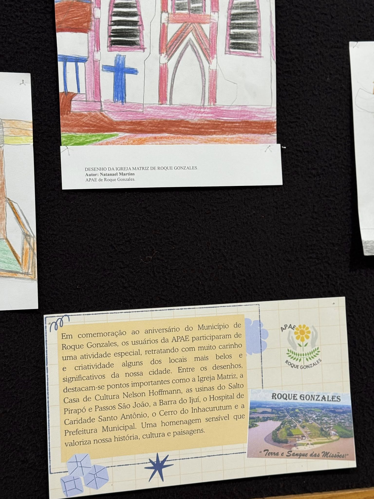 Em comemoração aos 59 anos de emancipação político-administrativa do município de Roque Gonzales, a APAE local promoveu uma emocionante atividade cultural que uniu arte, memória e valorização da história da cidade. Os usuários da instituição participaram de uma oficina criativa, na qual produziram desenhos retratando alguns dos pontos mais emblemáticos e queridos do município.