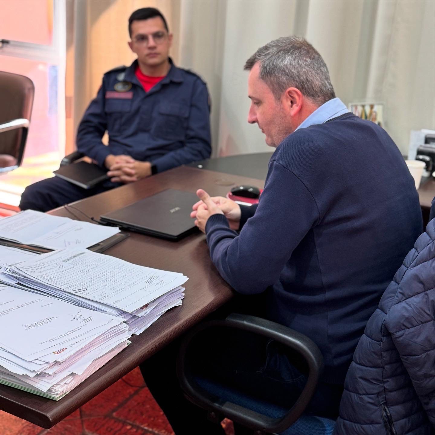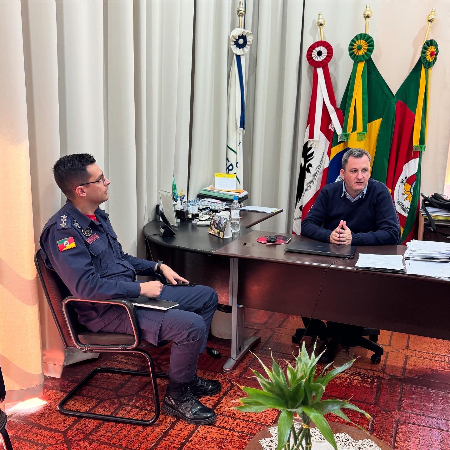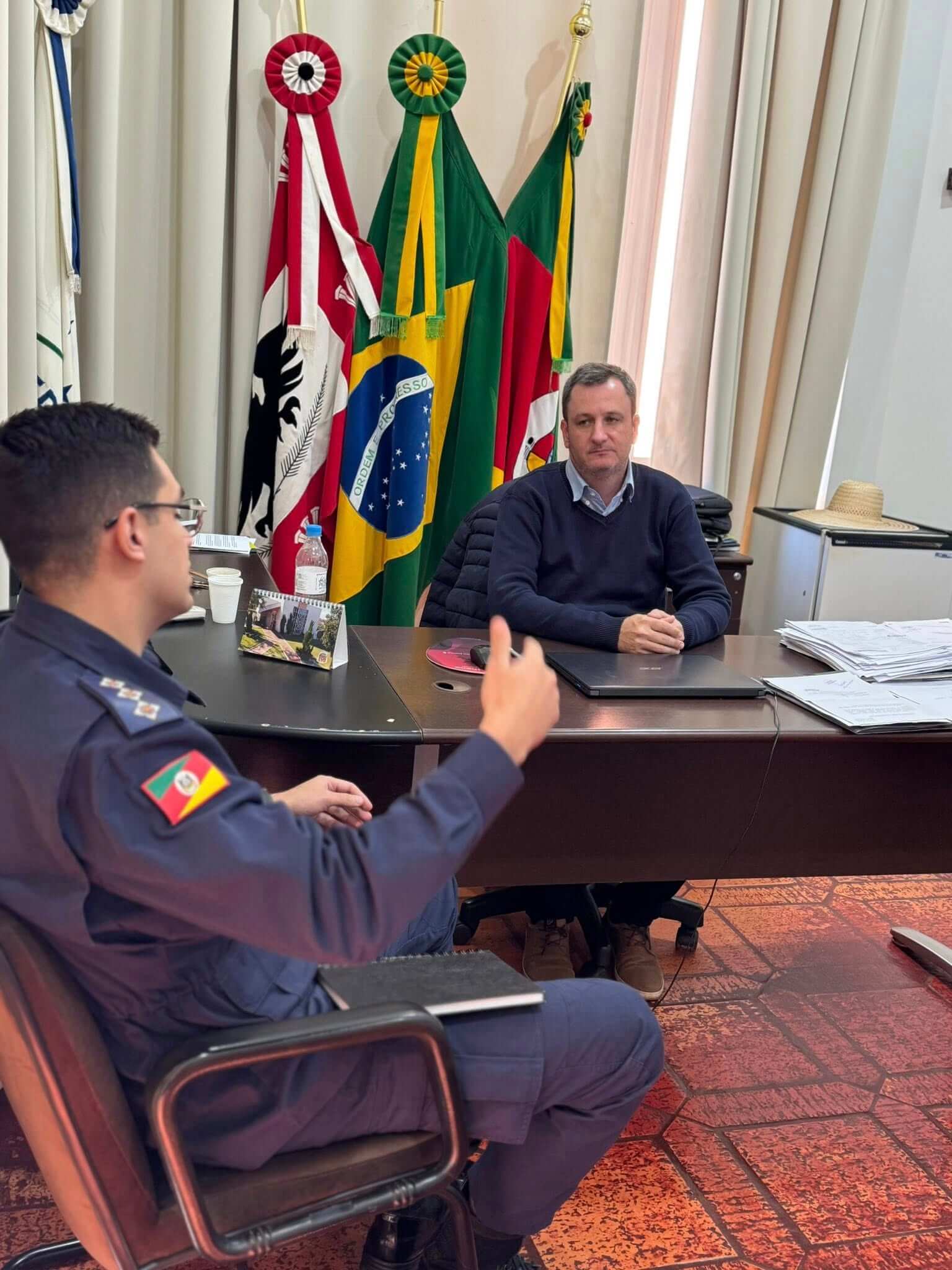 Na tarde desta terça-feira, 26 de agosto, o prefeito Fernando Mattes Machry recebeu em seu gabinete o Capitão Freitas, comandante da 1ª Companhia do 11° Batalhão de Bombeiros Militar de Santo Ângelo, acompanhado do Soldado Dutra.