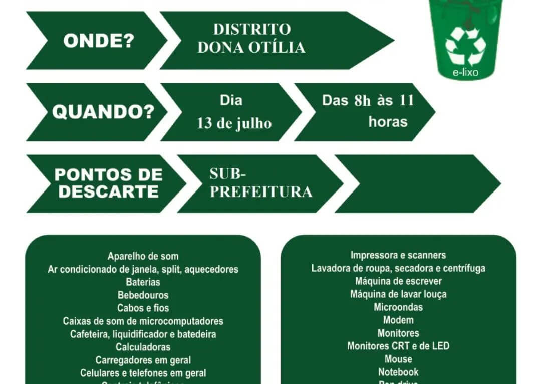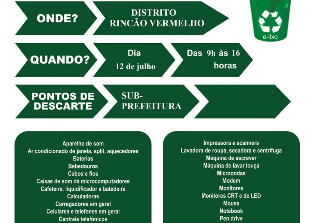 🌱 A Secretaria Municipal de Agricultura e Meio Ambiente promove no próximo dia 12 e 13 de julho, a Campanha de Descarte correto de lixo eletrônico na Cidade e nos Distritos do Município.
