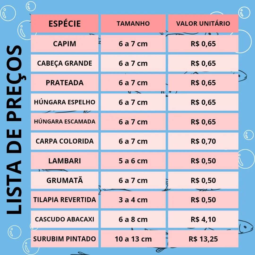 🐡 As espécies disponíveis são: capim, cabeça grande, prateada, húngara espelho, húngara escamada, carpa colorida, lambari, grumatã, tilapia revertida, cascudo abacaxi e surubim pintado.