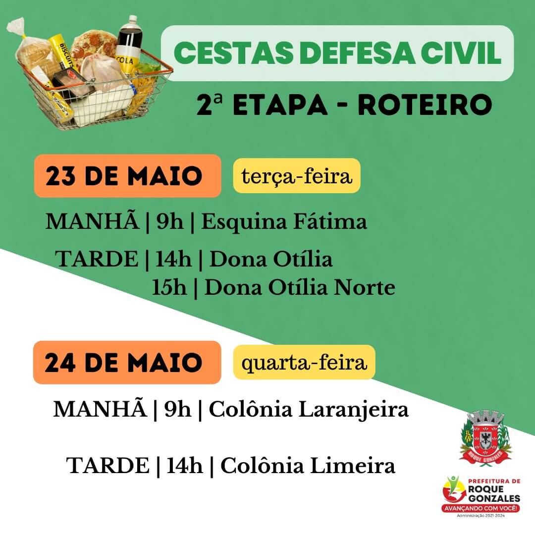A Prefeitura Municipal por meio da Coordenadoria da Defesa Civil Municipal segue nesta terça-feira, dia 23 de maio a entrega da 2ª etapa das Cestas Básicas da Defesa Civil, recurso este designado para os agricultores afetados pela estiagem.