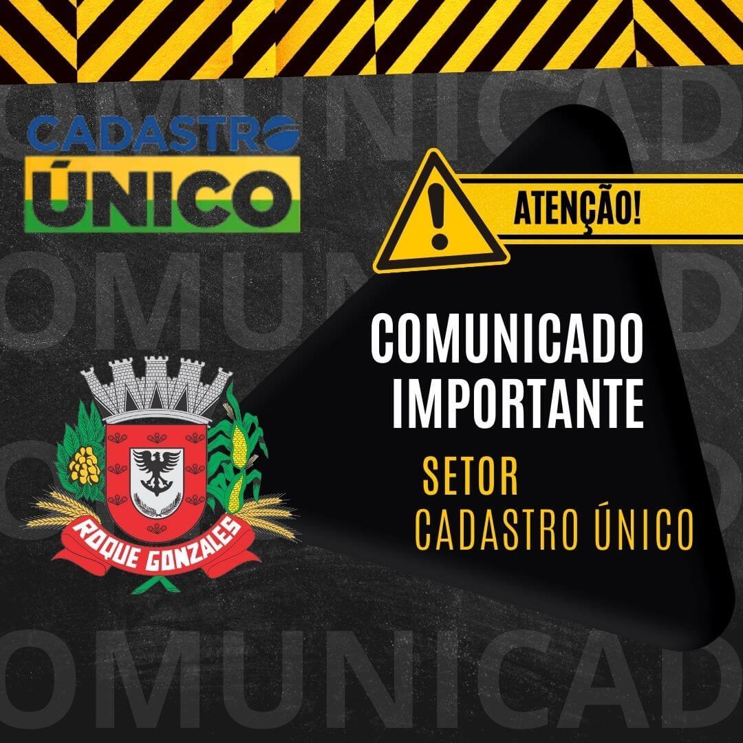 A Administração Municipal, por meio da Secretaria de Trabalho e Assistência Social, informa à comunidade roquegonzalense que, devido as férias da responsável pelo Cadastro Único o Setor estará fechado para atualizações e novos cadastros do dia 10 de fevereiro a 24 de fevereiro retornando os atendimentos em 25 de fevereiro.