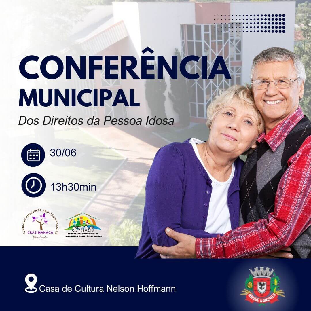 A Administração Municipal de Roque Gonzales, por meio da Secretaria de Trabalho e Assistência Social, convida toda a população para participar da Conferência Municipal dos Direitos da Pessoa Idosa, que acontecerá no dia 30 de junho de 2025 (segunda-feira), das 13h30min às 17h, na Casa de Cultura Nelson Hoffmann.