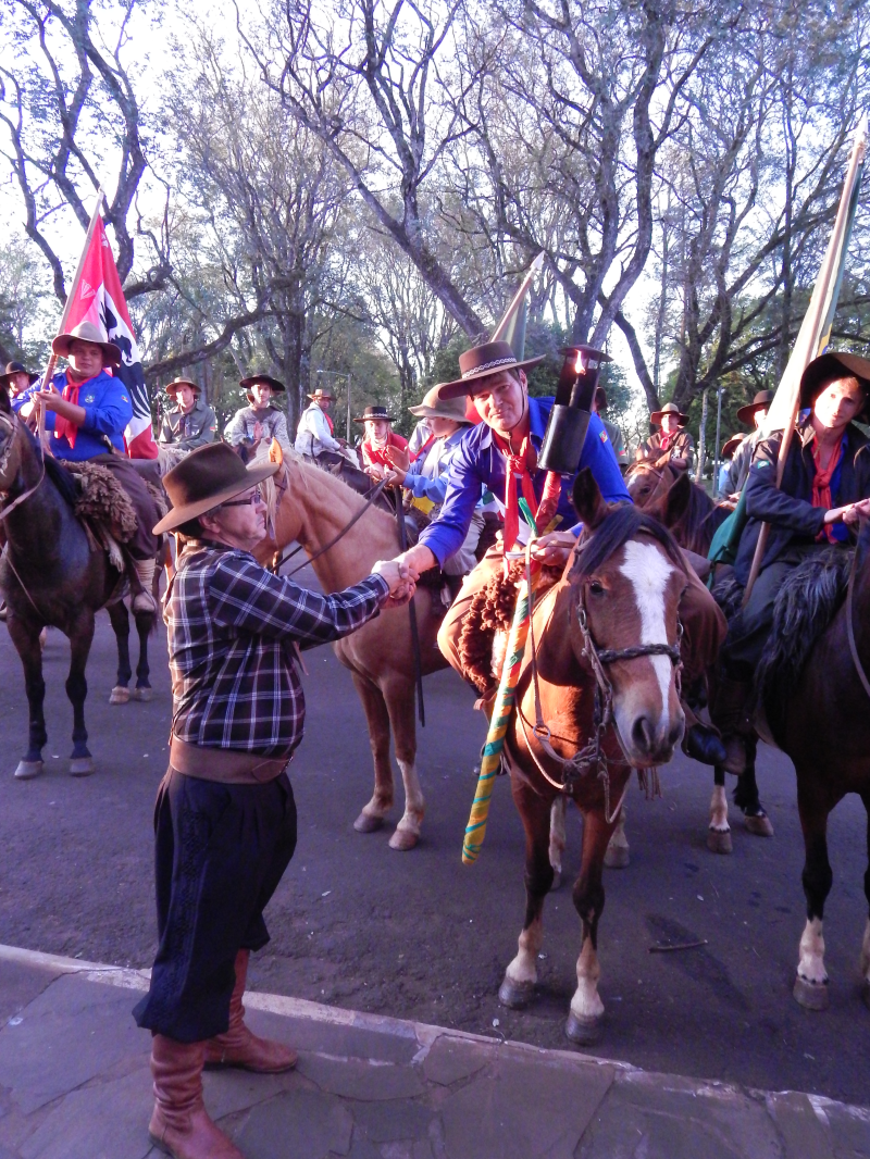 A chama, que veio do município de São Miguel das Missões,chegou em Roque Gonzales carregada por um cavalariano que veio acompanhado de peões do CTG Sentinelas da Cascata,do Patrão Luiz Mayer onde a entrega da chama ao Prfeito Municipal Sadi Wust Ribas, os Cavalarianos se dirigiram para o CTG para a abertura oficial da Semana Farroupilha,