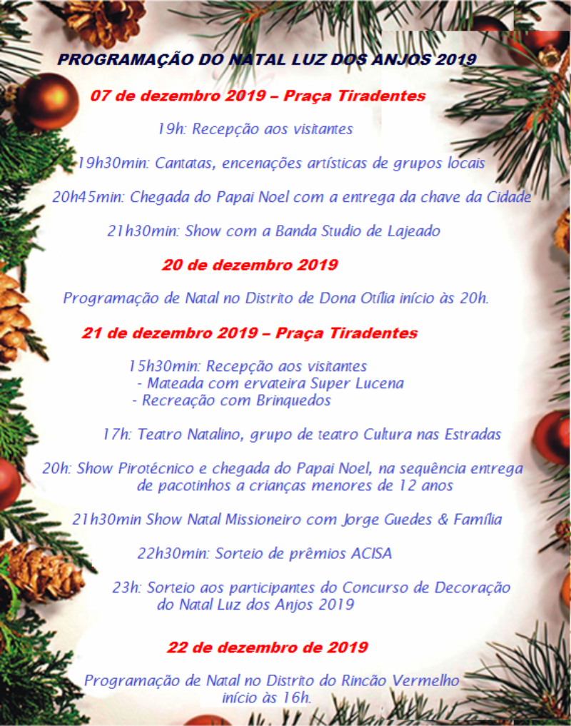 A programação do Natal Luz dos Anjos 2019, é a seguinte: