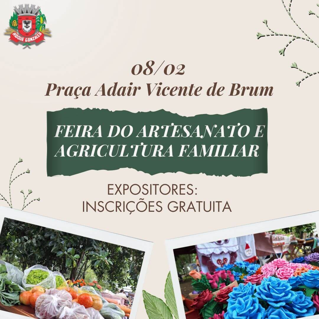 O Grupo de Feirantes de Roque Gonzales, em parceria com a Administração Municipal, o Sindicato dos Trabalhadores Rurais, a APAE e a EMATER, realizará no próximo sábado, 8 de fevereiro, a 3ª edição da Feira do Artesanato e Agricultura Familiar.