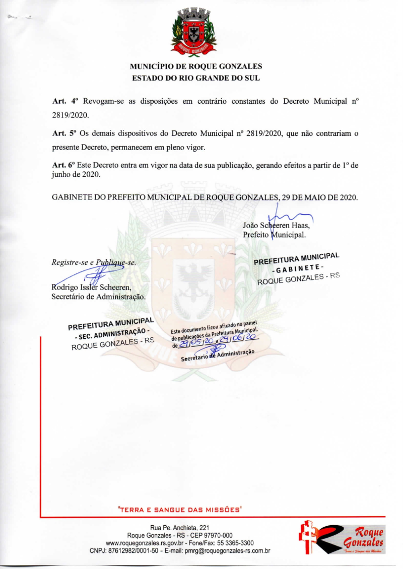 A Administração Municipal torna público Decreto n° 2.859, de 29 de maio de 2020, que segue o posicionamento do Governo do Estado do Rio Grande do Sul, o qual suspendeu até o dia 30 de junho de 2020 as aulas da Rede Estadual de Ensino, de forma presencial, e também considerando as Orientação n° 01/2020 e Nota Técnica n° 03/2020, ambas emitidas pela Secretaria Municipal de Educação, Cultura e Turismo, as quais determinam as medidas a serem adotadas pela Rede Municipal de Ensino durante o período de suspensão das atividades presenciais.