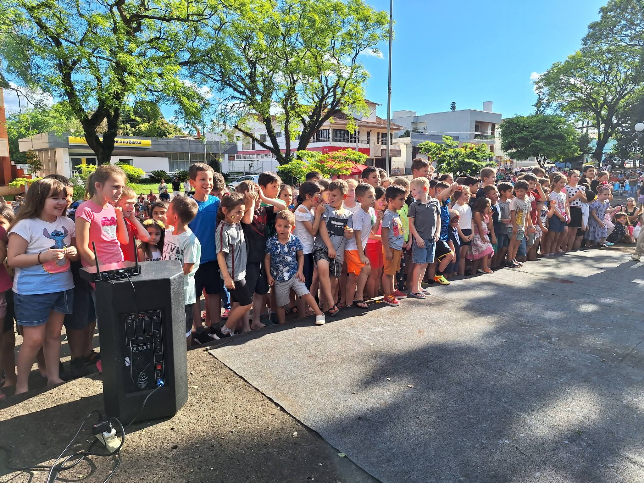 As apresentações Culturais ficaram a cargo dos alunos da Educação Infantil que encantaram o público presente. Entre as apresentações os palhaços pipoca e bolota fizeram a diversão da criançada.