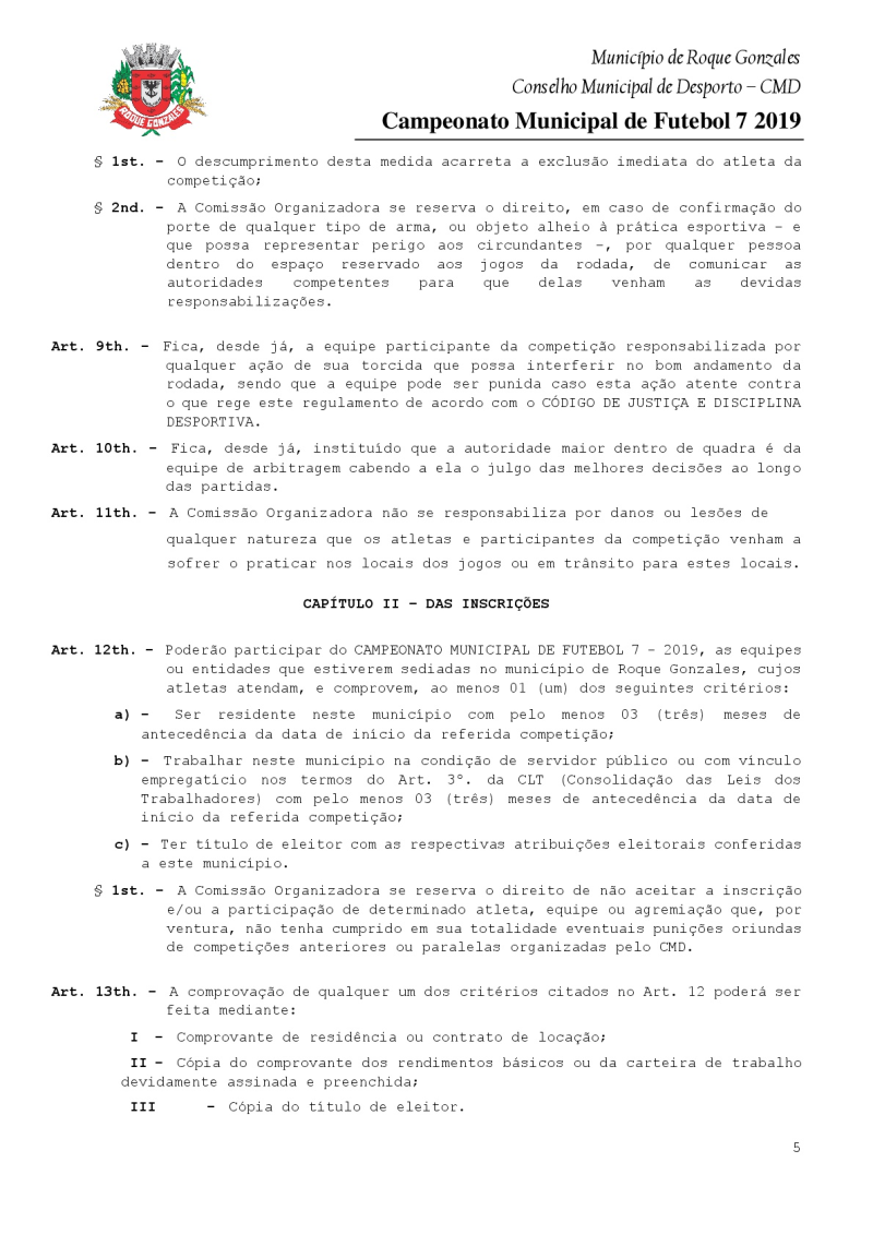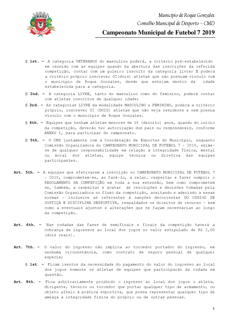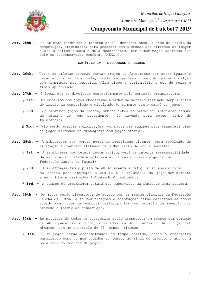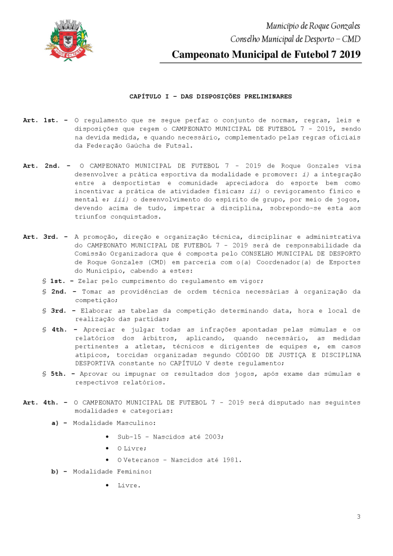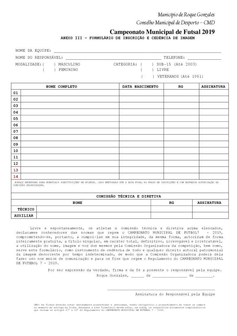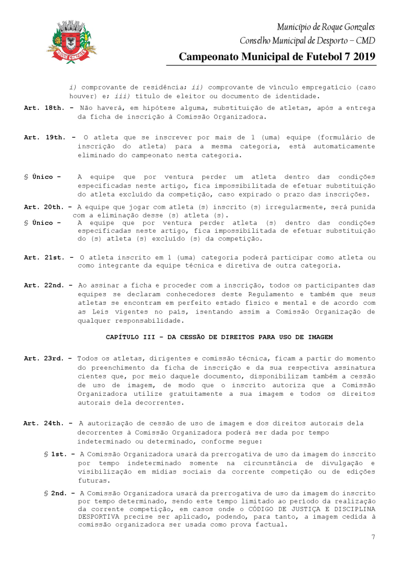 Estão à disposição as fichas de inscrição do Campeonato de Futebol 7 edição 2019 em Roque Gonzales. Neste ano o campeonato será composto por categoria masculina livre e veteranos, e categoria feminina.