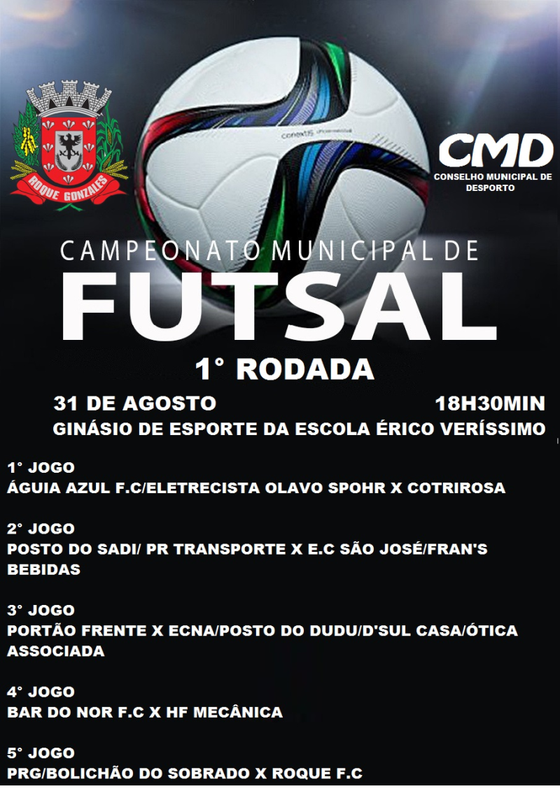 Neste sábado, 31 de agosto, o Ginásio da Escola Érico Veríssimo será palco do Campeonato Municipal de Futsal 2019, o campeonato conta com a participação de 13 equipes na categoria livre divididas em 2 grupos, grupo A Posto do Sadi/PR Transporte, E.C São José/Fran’s Bebidas, Bar do Nor F.C, HF Mecânica, União e E.C.F Niko Autocenter/Intromissões. O grupo B estão as equipes Portão Frente, ECNA/Posto do Dudu/D’Sul Casa/Ótica Associada, PRG/Bolichão do Sobrado, Roque F.C, Laboratório Biomédico, Águia Azul F.C/Eletricista Olavo Spohr e Cotrirosa.