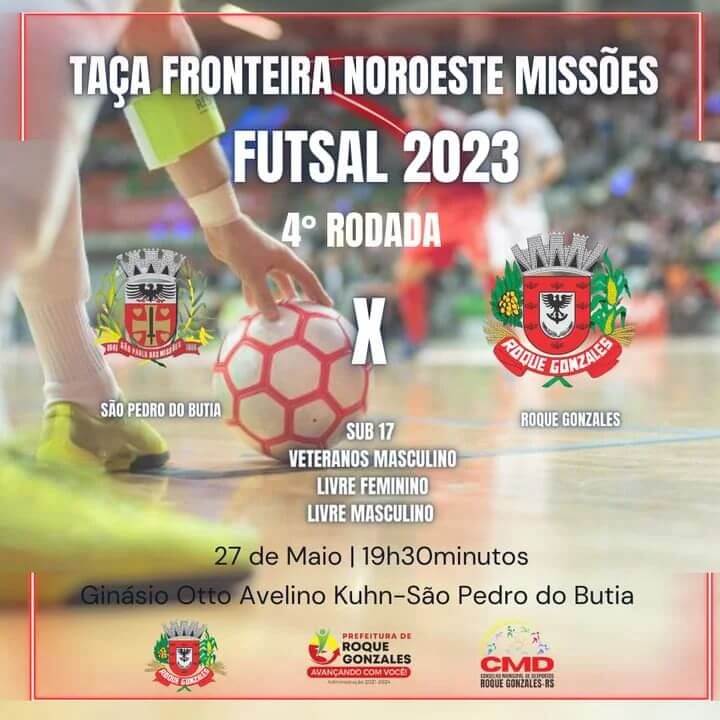 ⚽️ Taça Regional Fronteira Noroeste Missões de Futsal, última rodada da fase classificatória, sábado, dia 27 de maio a partir das 19h30min no Ginásio Otto Kuhn de São Pedro do Butiá.