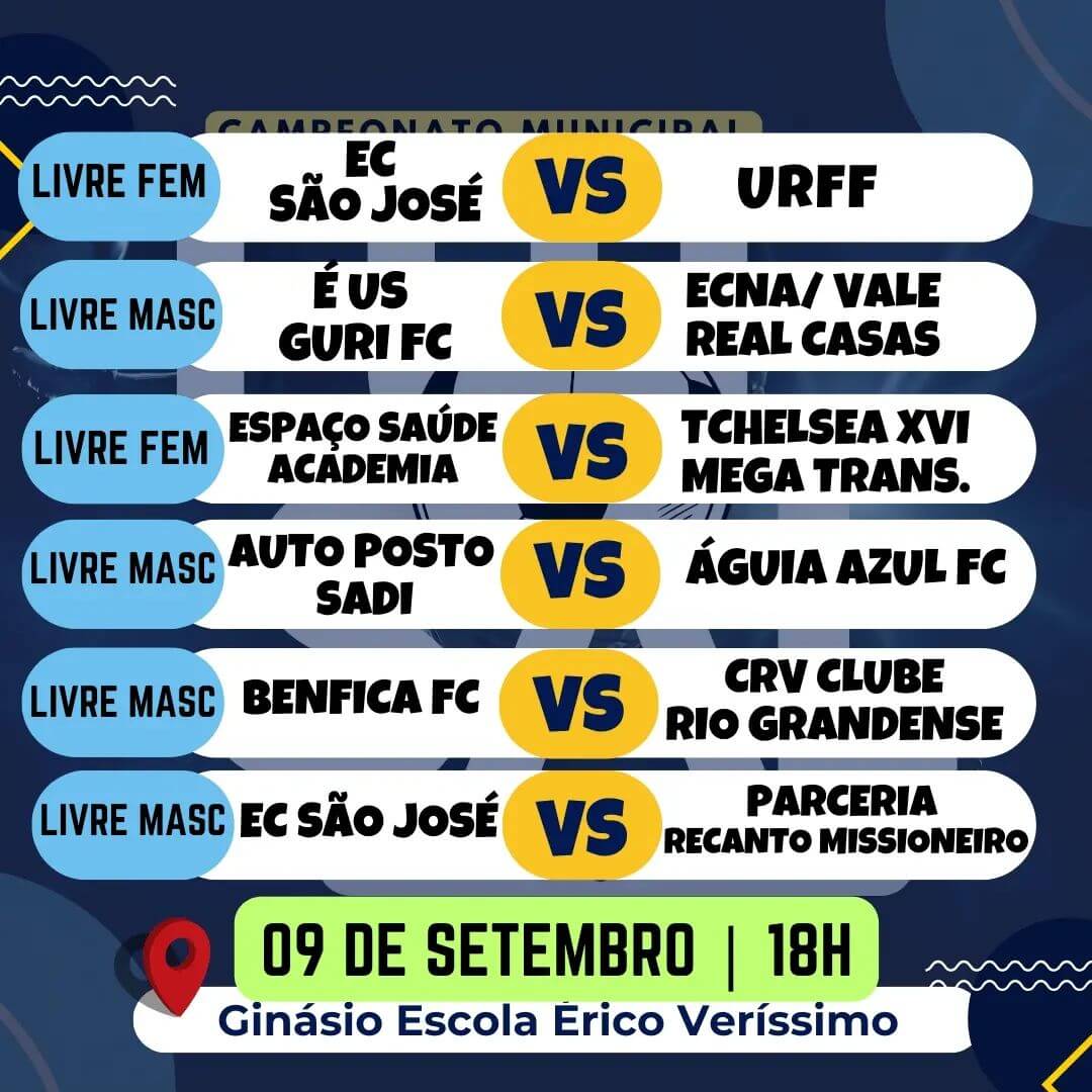 📆 Neste sábado, dia 09 de setembro a partir das 18 horas no Ginásio de Esportes da Escola Estadual Érico Veríssimo acontece a Segunda Rodada do Campeonato Municipal de Futsal 2023.