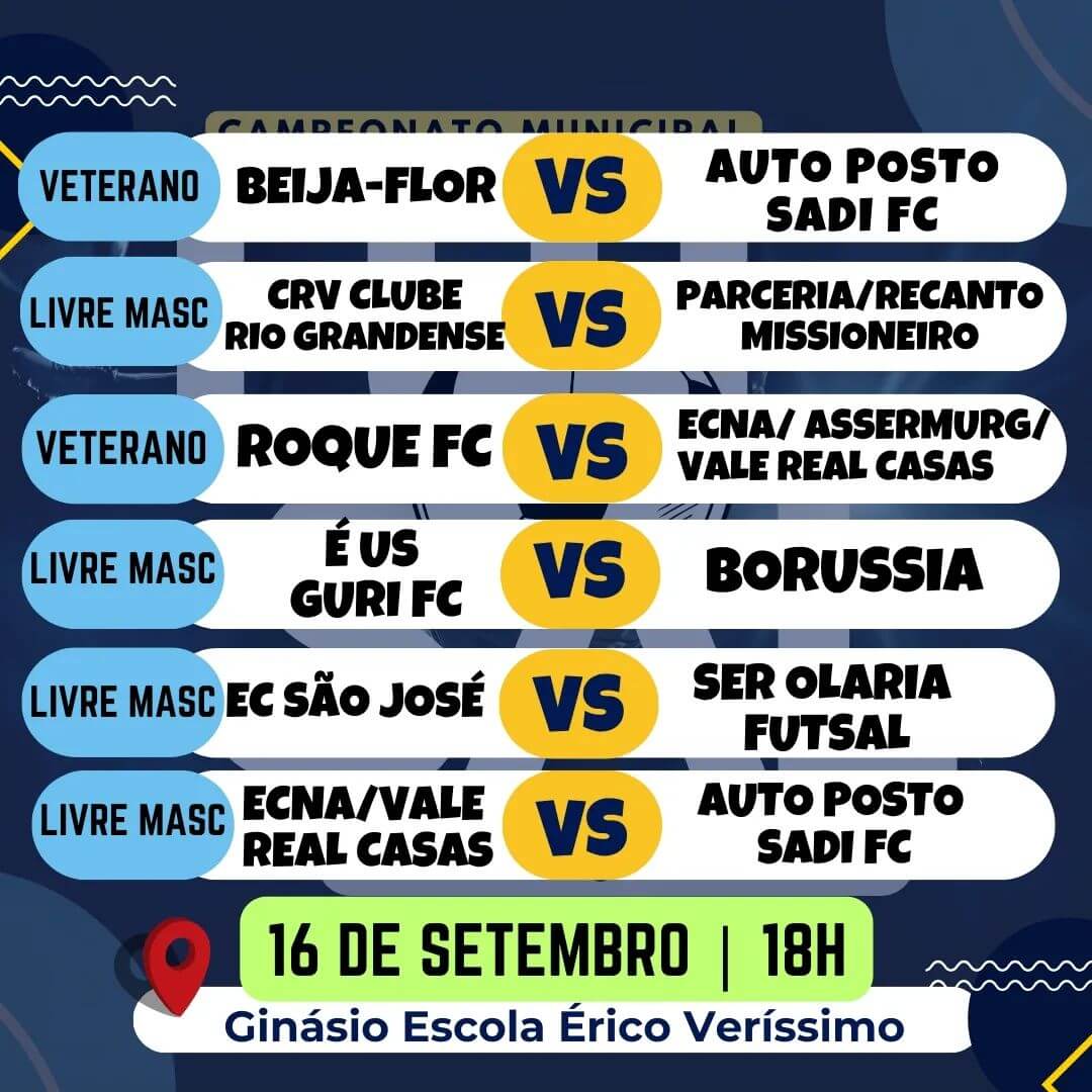 📆 Nesta sábado, dia 16 de setembro a partir das 18 horas no Ginásio da Escola Estadual Érico Veríssimo acontece mais uma Rodada.