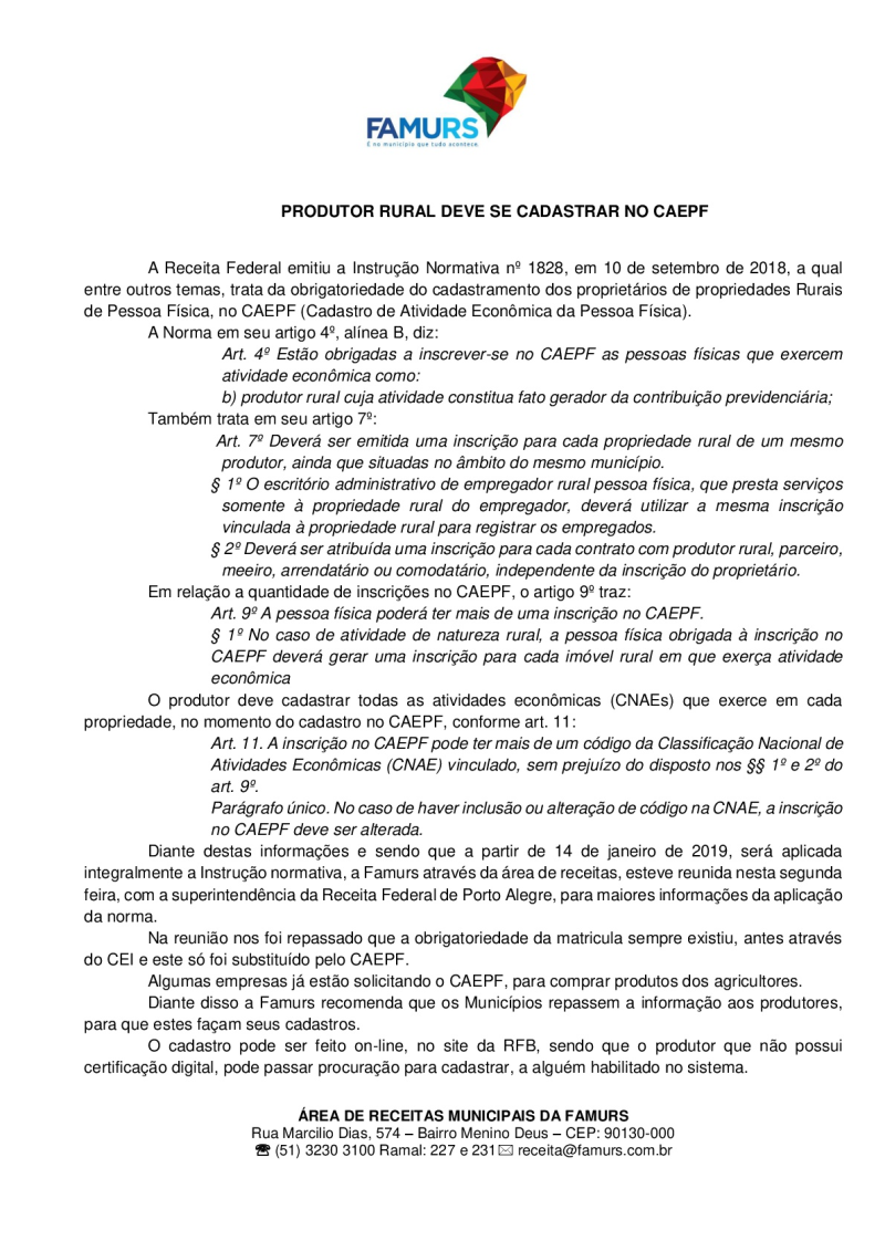 A inscrição no CAEPF, pode ser feita através do site da Receita Federal, nas unidades de atendimento da Receita Federal e também no Sindicato dos Trabalhadores Rurais de Roque Gonzales, que deste de ontem já realiza as inscrições, e o produtor deve apresentar RG e CPF para se cadastrar.