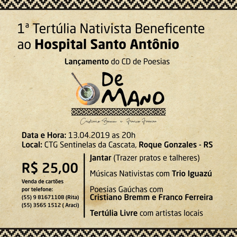 O evento será realizado no dia 13 de abril, nas dependências do CTG Sentinelas da Cascata, com início às 20h, onde haverá jantar, e na sequência contará com apresentações de músicas nativistas com o Trio Iguazú, poesias gaúchas com Cristiano Bremm e Franco Ferreira e tertúlia livre com artistas locais.