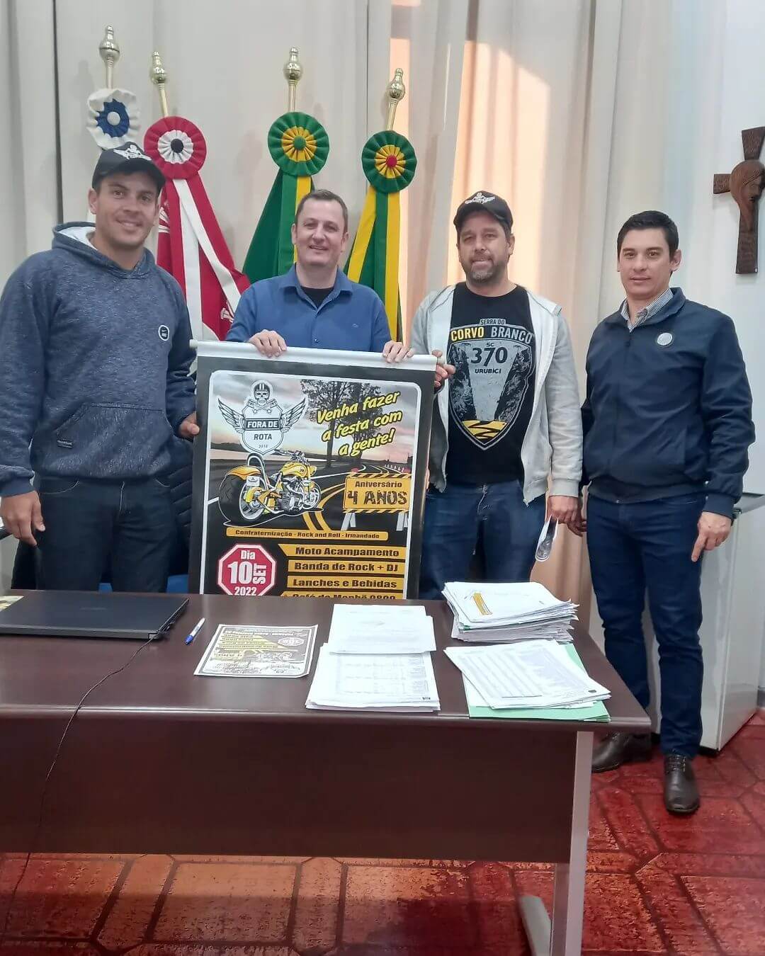 📆 Nesta manhã de quarta-feira (31), Prefeito Municipal Fernando Mattes Machry acompanhado do Assessor Jurídico Andrei Becker receberam os integrantes do Moto Grupo Fora de Rota para entregar Ofício de Convite para o evento do Aniversário de 4 Anos do Moto Grupo Fora de Rota.