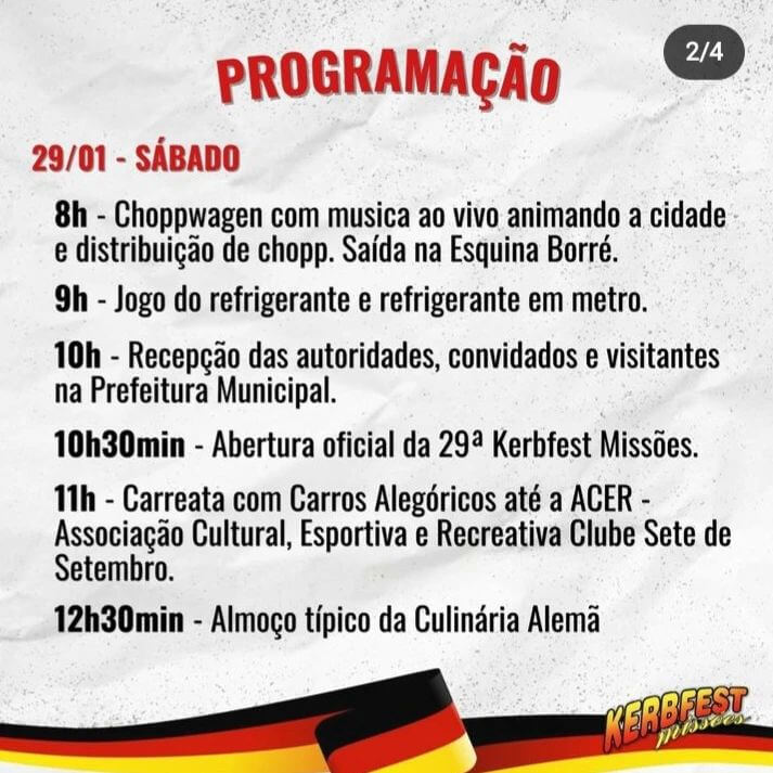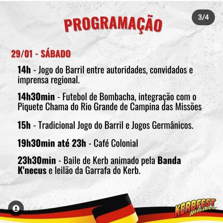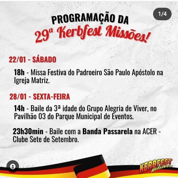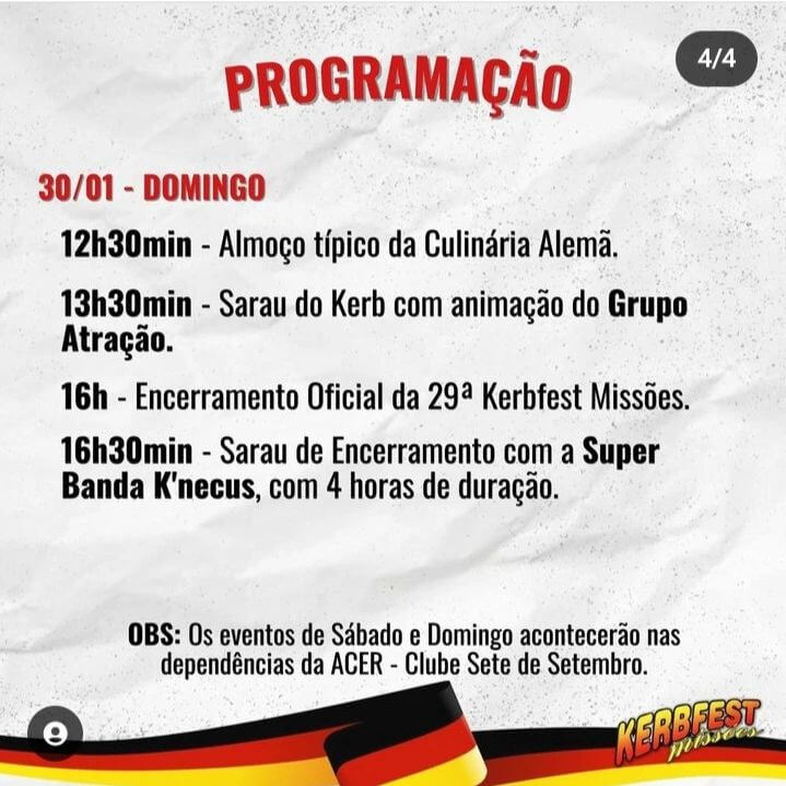 🍻 Confira a programação completa desta festa (arrasta pro lado). E, também, de acompanhar o perfil da @kerbfest.missoes
