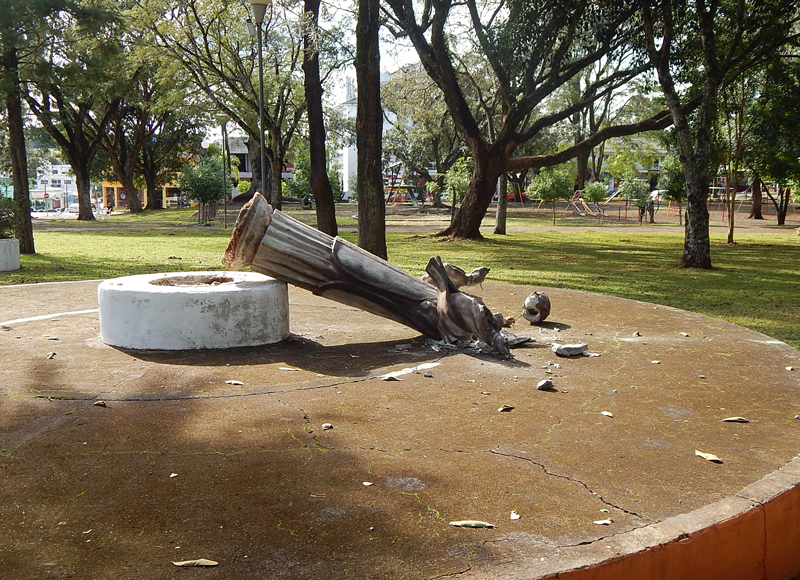 A estátua em homenagem ao Padre Roque Gonzales, localizada na Praça Tiradentes, foi destruída por ações de vandalismo. A escultura foi encontrada, na manhã desta sexta-feira, caída no chão e com a cabeça quebrada.