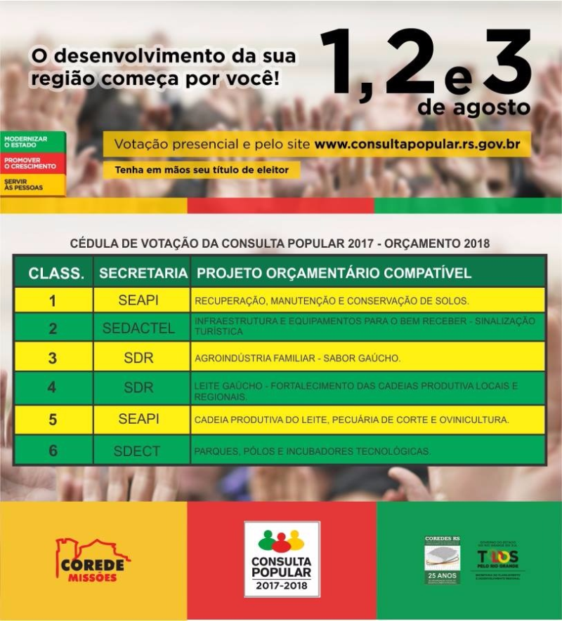 A votação já ocorre desde o dia 1º e estende-se até o dia 03 de agosto tanto presencialmente como pela internet através do site: www.consultapopular.rs.gov.br, sendo necessário o título de eleitor para a efetivação do voto. Exerça seu poder de cidadania, procure os posto de votação na cidade ou pela internet e contribua para a melhoria do nosso Município, Região e Estado.