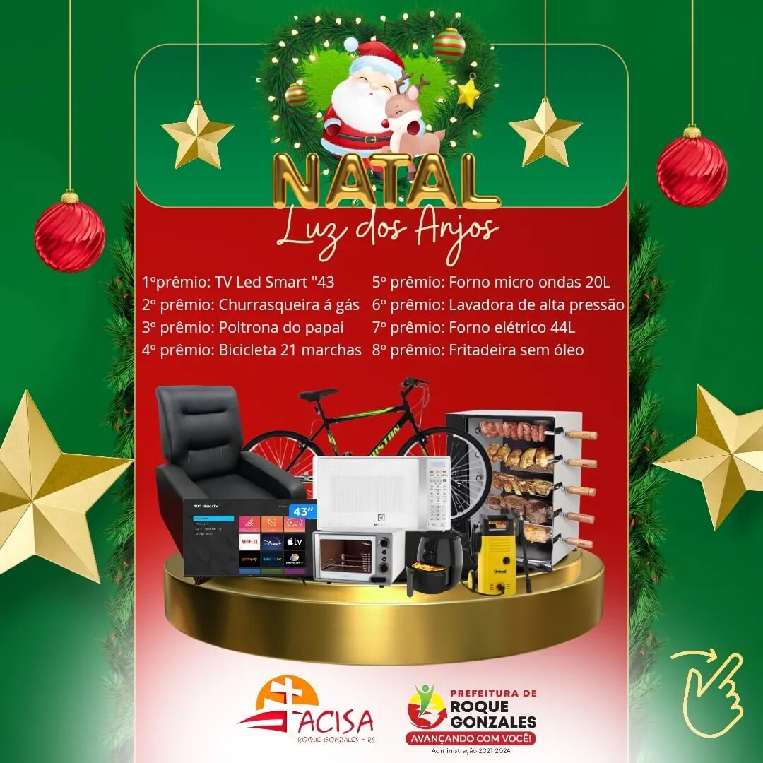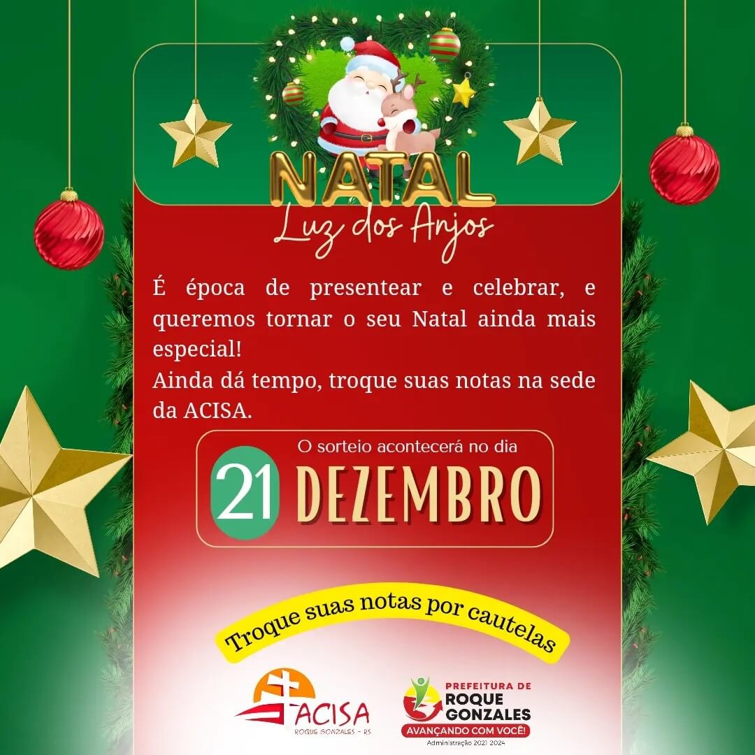 🍀Não perca essa oportunidade de participar do sorteio de prêmios . O sorteio acontece nesta quinta-feira, dia 21 de dezembro fazendo parte das Programações do Matal Luz dos Anjos.