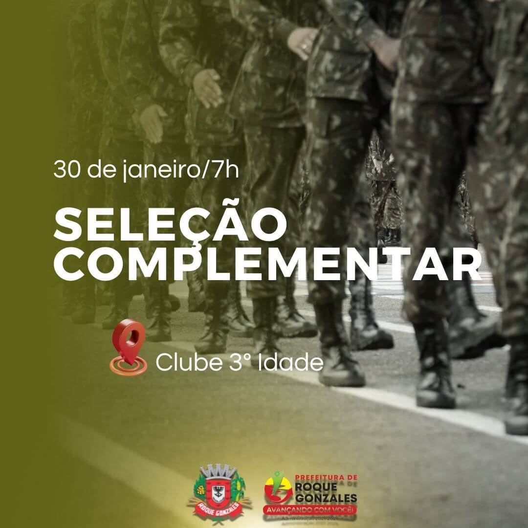 A Junta de Serviço Militar de Roque Gonzales comunica a todos os jovens alistados para a Seleção Complementar (Segunda inspeção) que irá acontecer no dia: