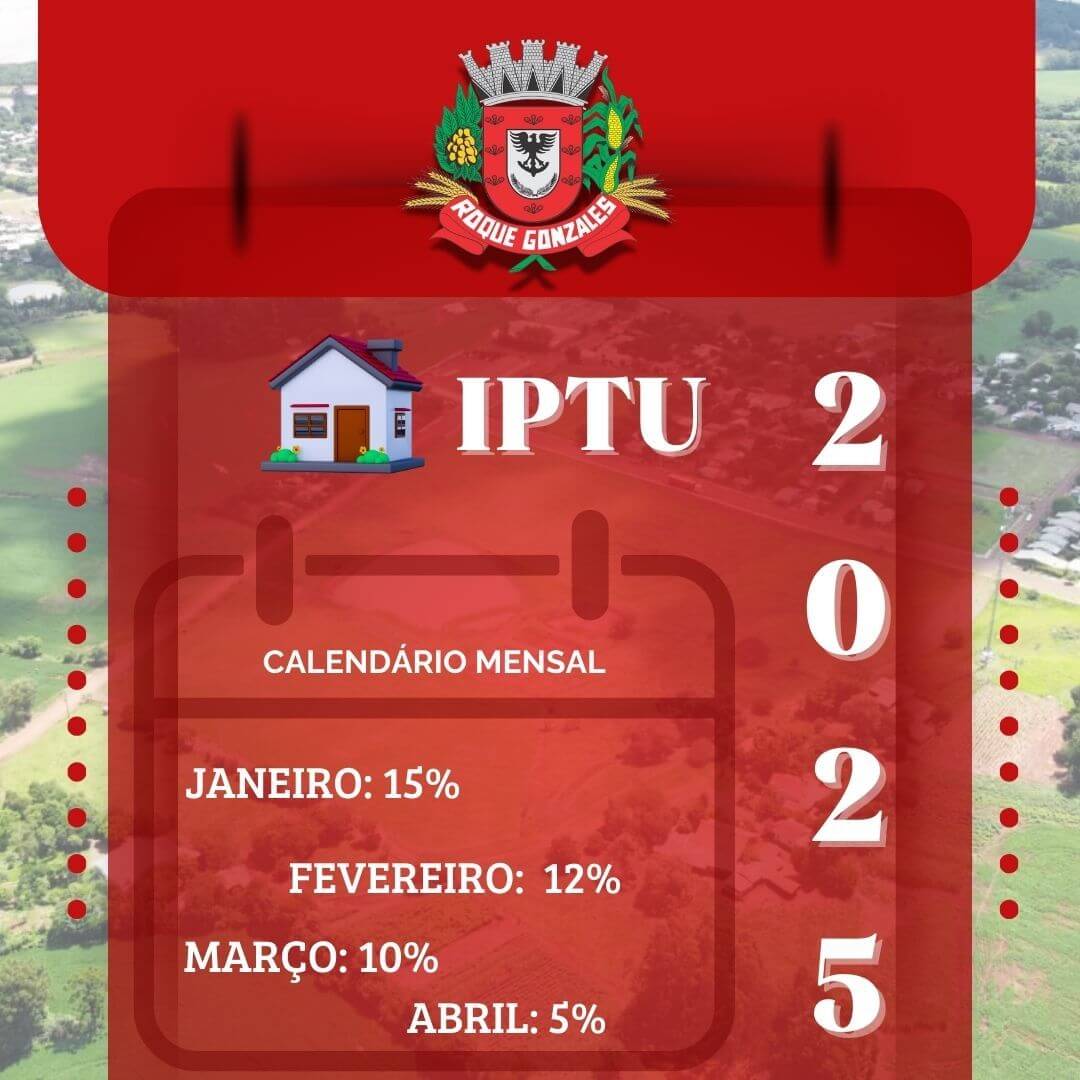 A Administração Municipal, por meio da Secretaria de Finanças, comunica a todos os contribuintes de Roque Gonzales que os valores do Imposto Predial e Territorial Urbano (IPTU) já estão disponíveis para consulta e pagamento, com descontos previstos até o dia 30 de abril de 2025.