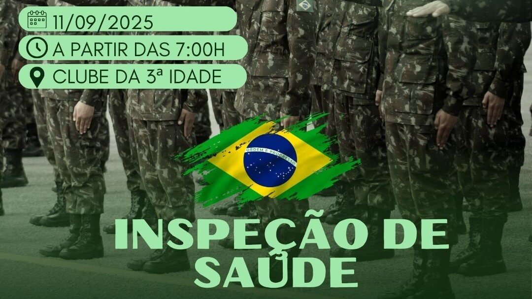 O Setor de Serviço Militar do município informa que todos os jovens que realizaram o alistamento devem comparecer para a Inspeção de Saúde Militar, que acontecerá no dia 11 de setembro, a partir das 7h, no Clube da Terceira Idade.