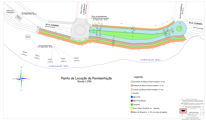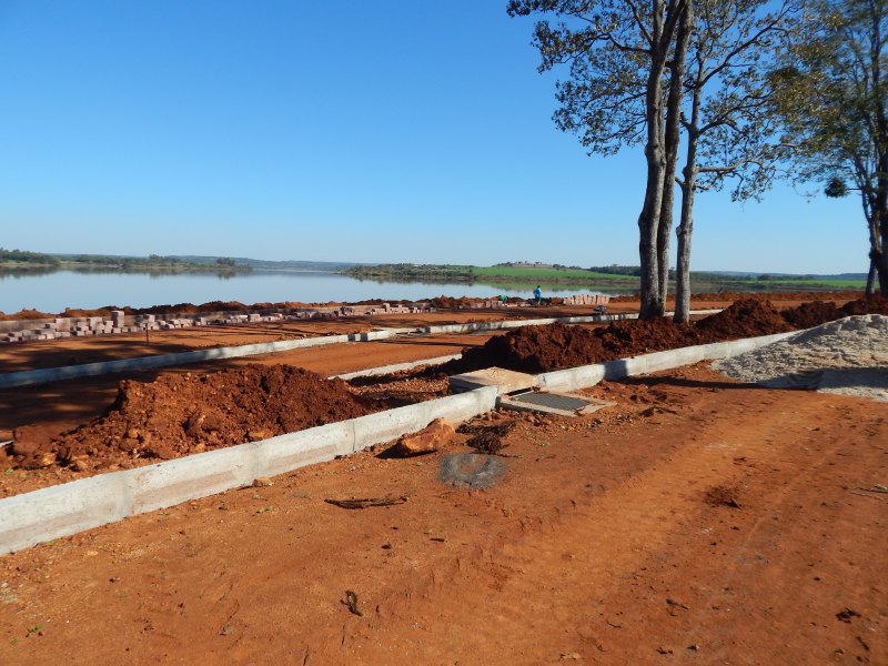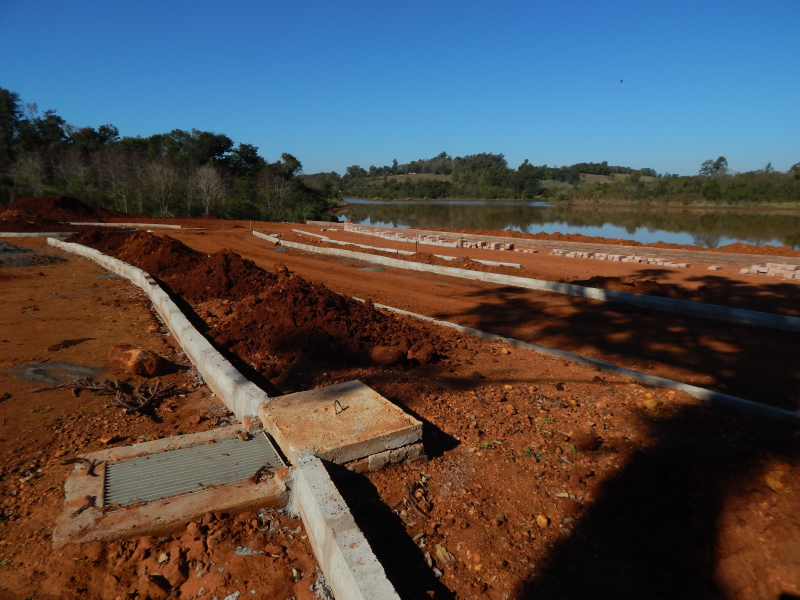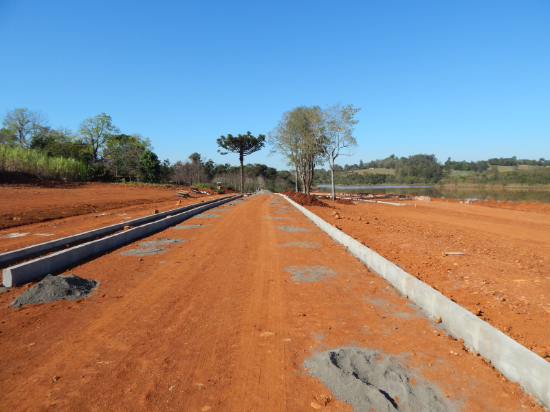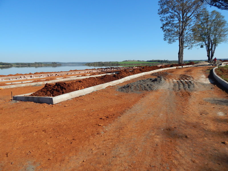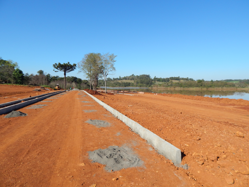 As obras de construção do Balneário Municipal, está com a segunda etapa em andamento, e com processo bem avançando, onde a equipe de trabalho que atua na obra já está realizando a construção do muro que delimita o passeio a beira do lago, bem como, as rótulas, e colocação dos meios fios, para dar seqüência a pavimentação da Rua Zimmer.