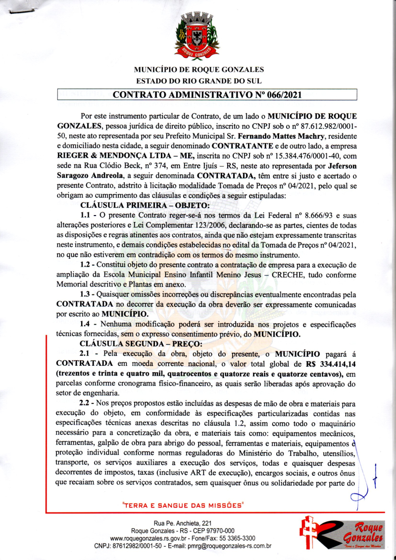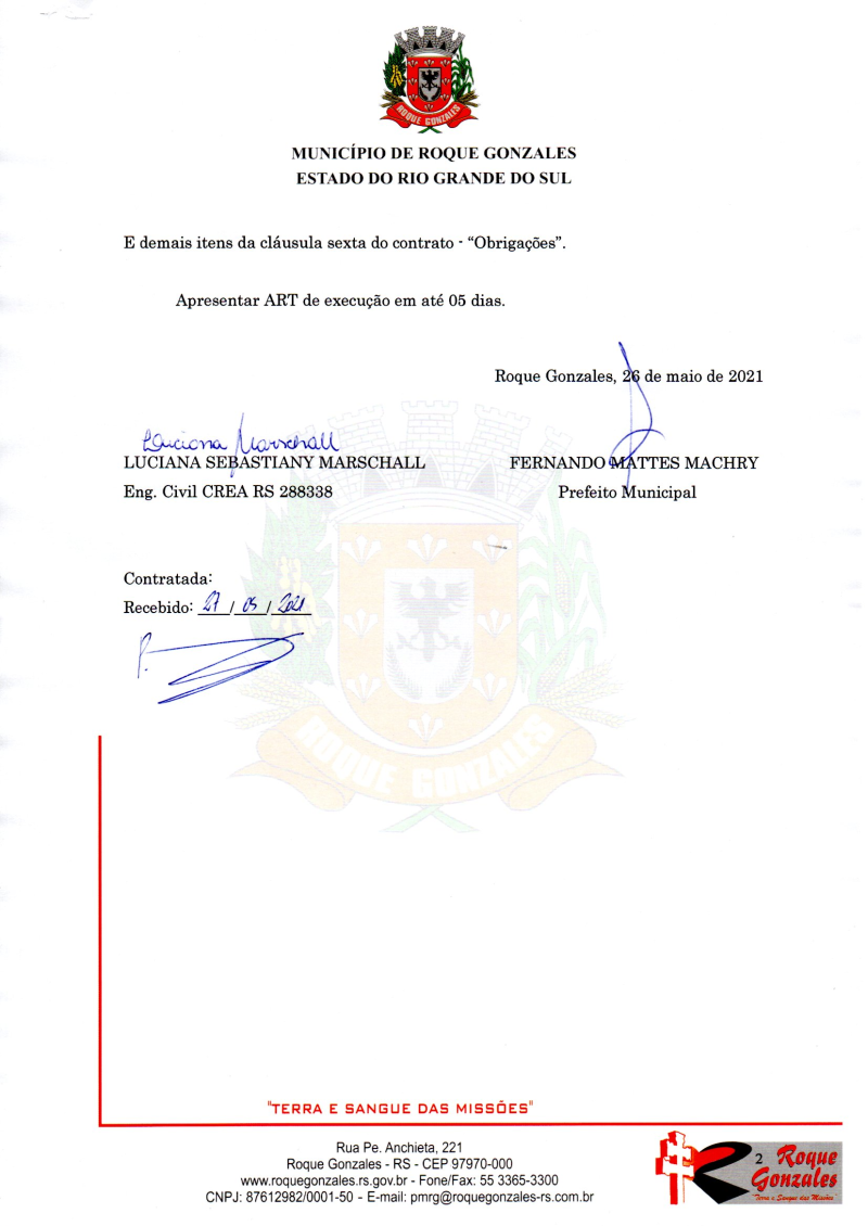 A empresa vencedora da licitação foi Rigger e Mendonça LTDA com sede no município de Entre Ijuís, que apresentou a menor proposta no valor de R$334.414,14. O contrato já foi assinado pelas partes e hoje, dia 27 foi emitida e recebida pela empresa a ordem de início das obras.