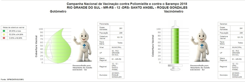 Como a meta estipulada pelo Ministério da Saúde foi alcançada, a Secretaria de Saúde de Roque Gonzales comunica que a Campanha Nacional de Vacinação contra a Poliomielite (Paralisia Infantil) e contra o Sarampo, está oficialmente encerrada no município. Estados e Municípios que ainda não atingiram a meta de vacinar pelo menos 95% do público-alvo, por orientação do Ministério da Saúde seguem com a campanha até o dia 15 de setembro.