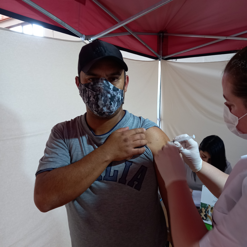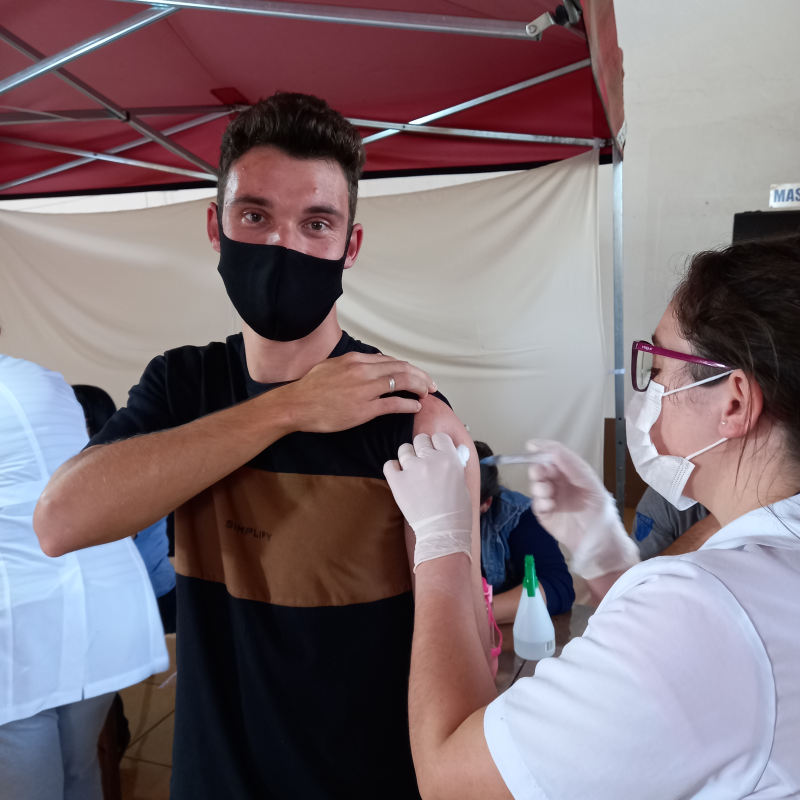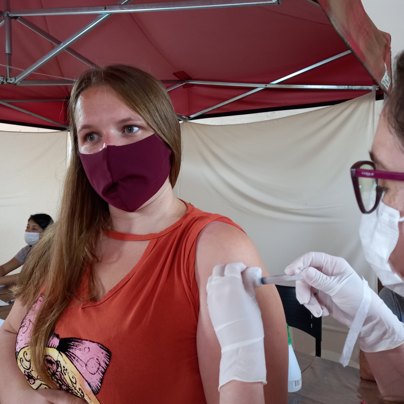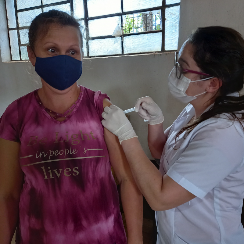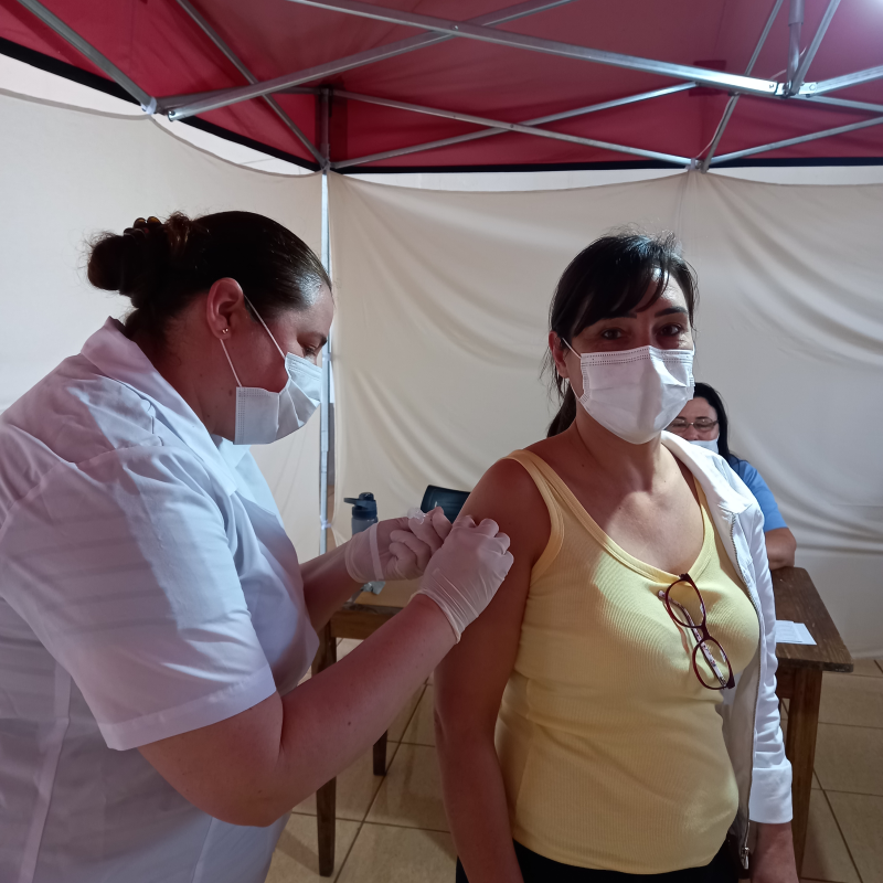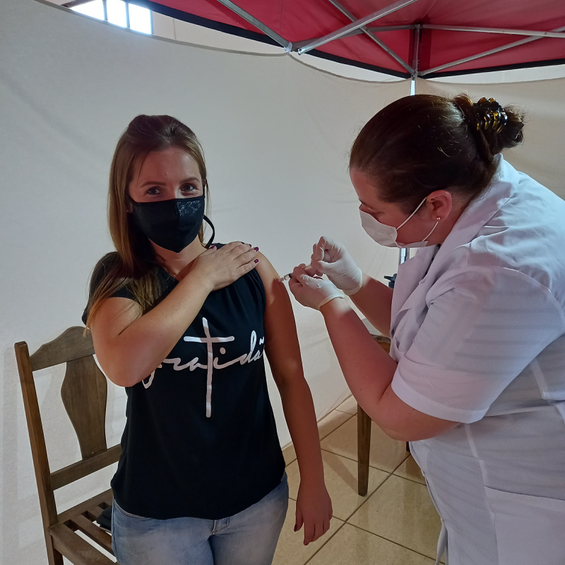 Receber essa primeira dose já me deixa um pouco mais tranquila em relação a contrair ou mesmo passar o vírus para outras pessoas, já que trabalho na Escola Municipal de Ensino Fundamental Santo Antônio de Pádua, a maior do Município de Roque Gonzales.