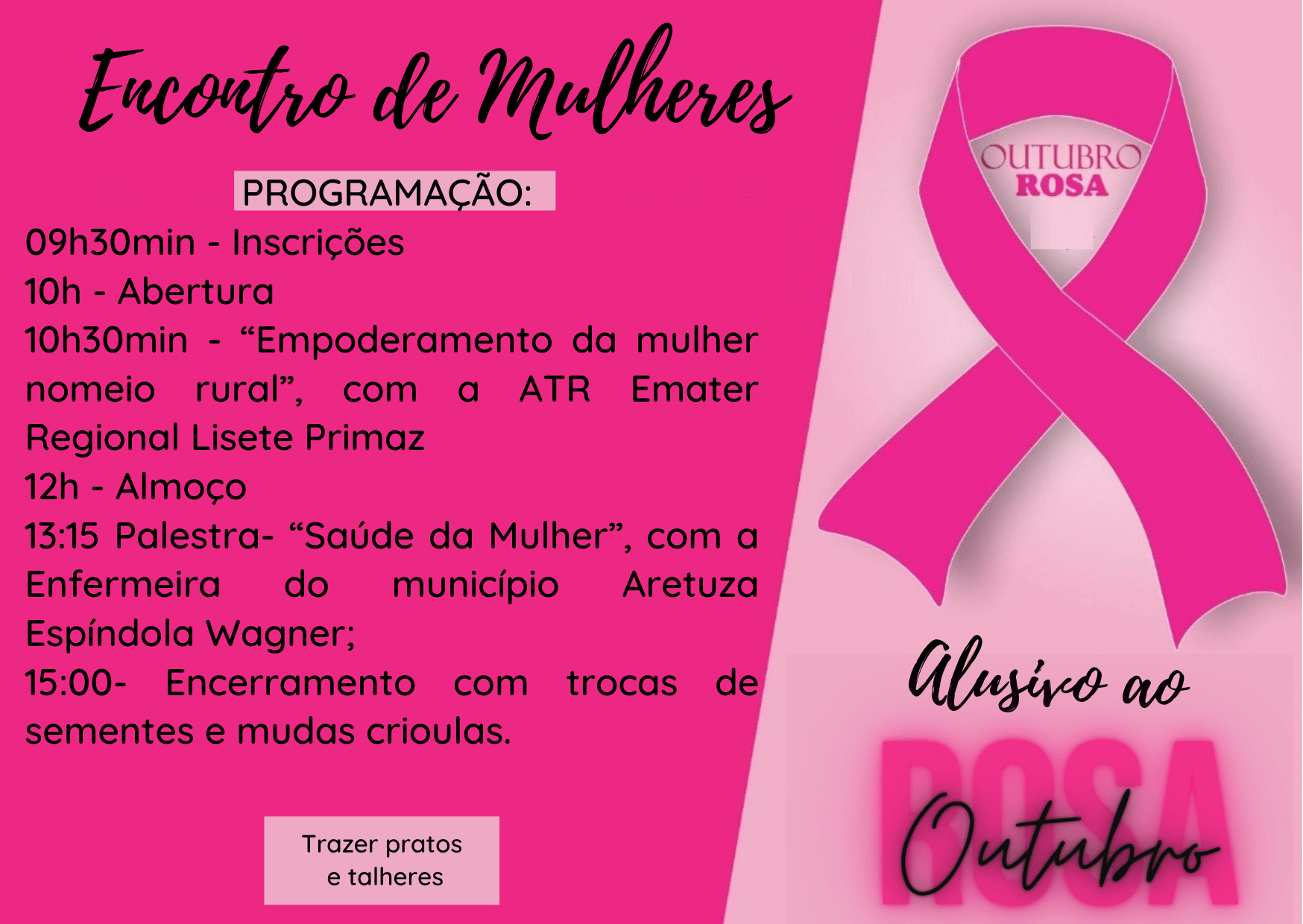 A Prefeitura Municipal de Roque Gonzales em parceria com o Conselho de Clube de Mães, Emater e Sindicato dos Trabalhadores Rurais promovem: "ENCONTRO DE MULHERES".