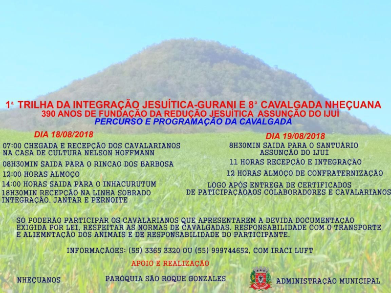 Com o objetivo de promover e valorizar a história jesuítica-guarani, a Secretaria Municipal de Educação, Cultura e Turismo realizará a 1a Trilha da Integração Jesuítica-Guarani, nos dias 18 e 19 de agosto de 2018.
